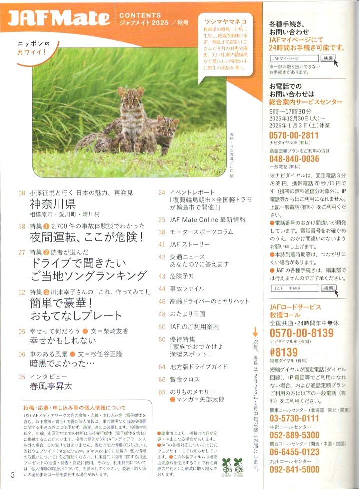 ★JAF Mate ジャフメイト|2025年 秋号|表紙ツシマヤマネコ|小澤征悦 松任谷正隆 矢部太郎 春風亭昇太|神奈川県 相模原市 愛川町 清川村 收藏