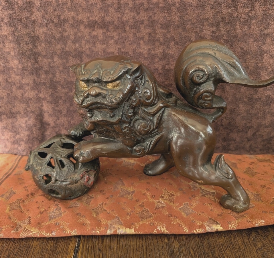 玉乗唐獅子 鉄製 鋳物 置物 開運 風水 魔除け 縁起物 古美術 骨董 鉄 狛犬 唐獅子 床の間飾り オブジェ 收藏