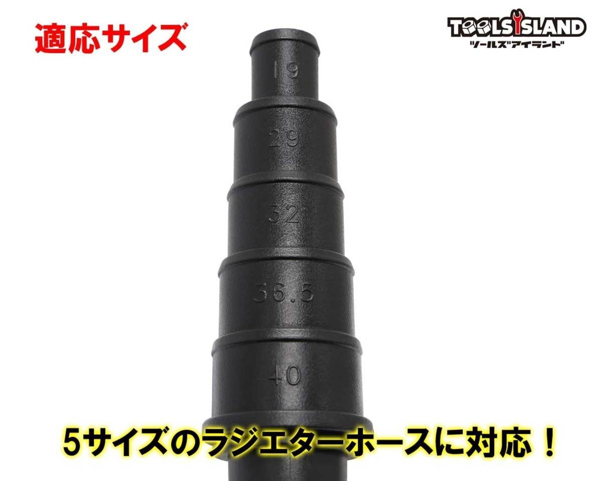 | 仕様 | 本体サイズ:350×120×45 対応ラジエターアッパーホース径 :19mm 29mm 32mm 36.5mm 40mm 使用エアー圧力:6.3kgf/cm2 重さ:370g |