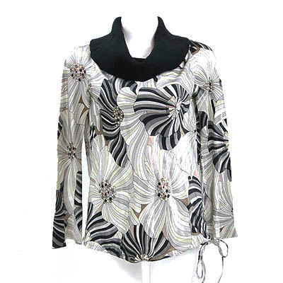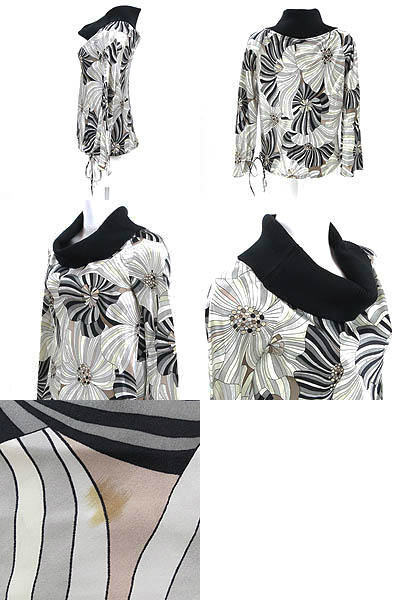 | シックな花柄のトップス入荷♪ 大き目の花柄が上品な雰囲気を演出してくれます。 首元は大きめのネックになっていて、小顔効果が期待できますよ☆ 左裾部分のリボンで裾を絞ることも可能♪ 少し絞るだけでも、大きく違った雰囲気に変われます。 右袖の部分に小さな汚れがございます。 着丈約53㎝ 袖丈約48.5㎝ 肩幅約28㎝ バスト約88㎝ 【サイズ】:(S) 【素 材】:(シルク100%・リブ部分 毛87%・カシミヤ10%・レーヨン3%) 【 色 】:(黒) 【程 度】:(B) 20101004-002 409 013 | ||||