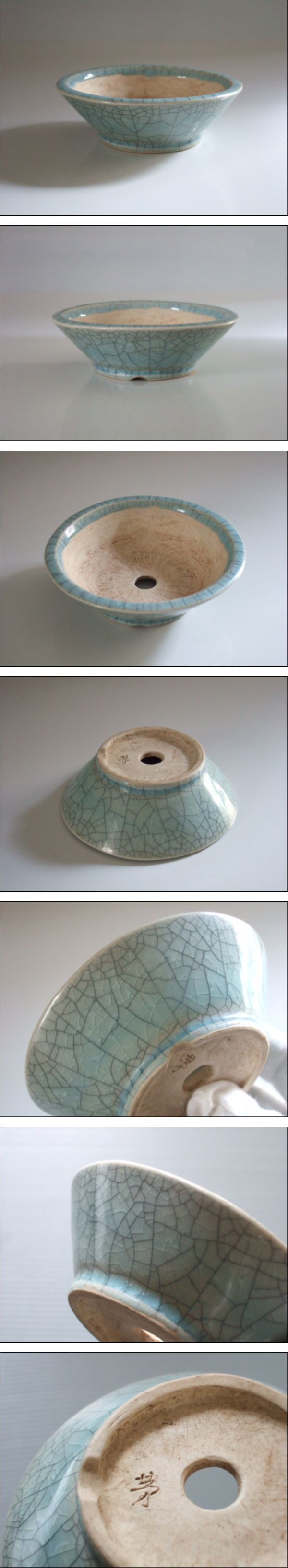 | 商品説明 | 宋代官窯青磁風の味わい、茅山人作、盆栽鉢。 外寸 径 10.5㎝、高さ 3.5㎝程。無傷。在銘。 □ 送料 / 無料にて承ります。free shipping。 |