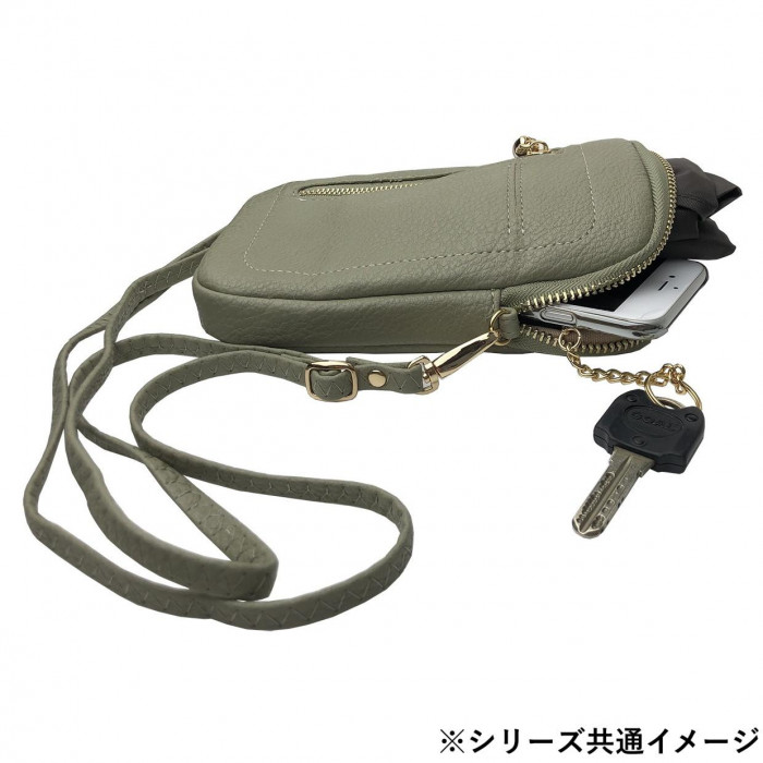 | 仕様 | ファスナーポケット×2 カードポケット×4 エコバッグ収納ポケット×1 バックポケット×1 取り外し可能キーリング×1 ショルダー調節可能幅:78~143cm 金具色:GOLD |