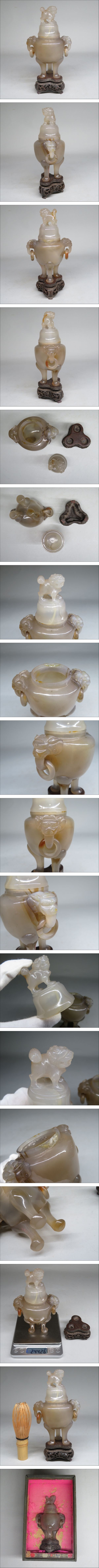 | 【東】清時代 メノウ 瑪瑙製 双耳遊環三足香炉 獅子摘蓋 唐木台付き 中国美術/古美術・骨董品 | ||