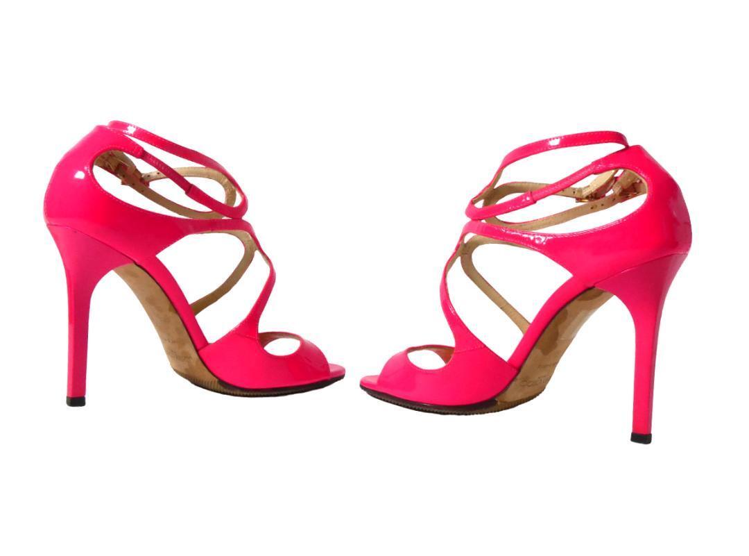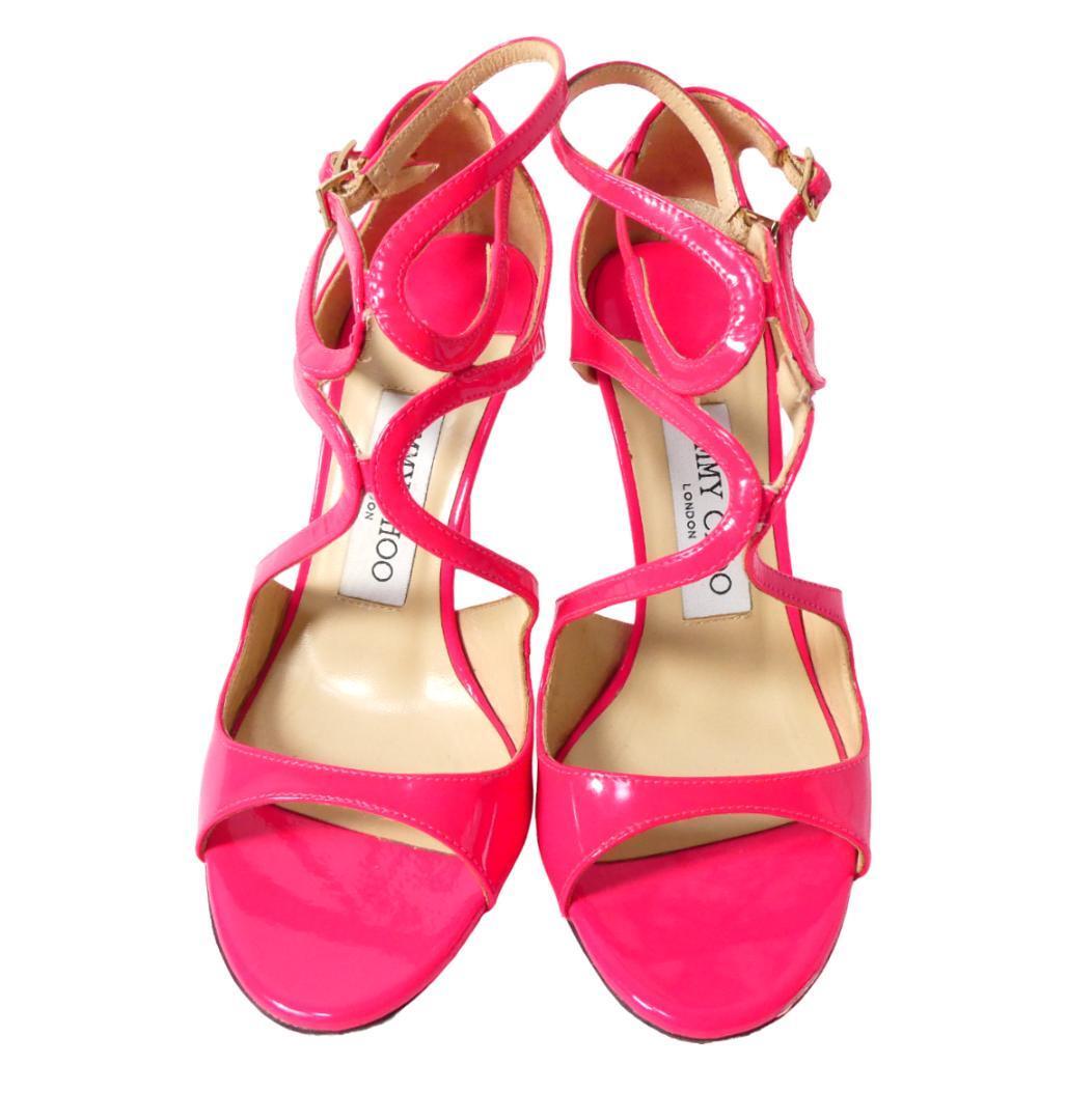 美品 JIMMY CHOO ジミーチュウ サイズ35 約22㎝ パテントレザー アンクルストラップ オープントゥ ハイヒール サンダル パンプス ピンク 收藏