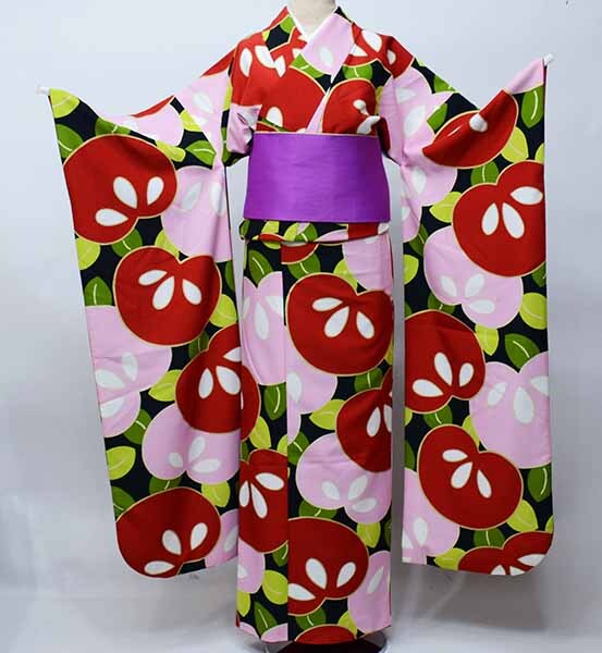振袖 着物 単品 合繊 仕立て上がり 大柄 黒色×ピンク×赤色 小紋柄 成人式 結納 結婚式 新品(株)安田屋 NO41181-1 收藏