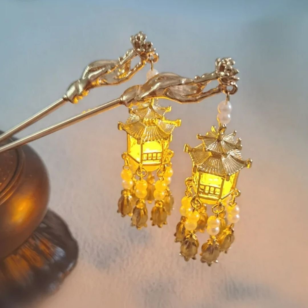ヘアアクセサリー 簪 ランタン付き 髪飾り LEDライト かんざし 一本 ゴールド 蓮の花 光る ランタン 六角提灯 発光 中華風 收藏