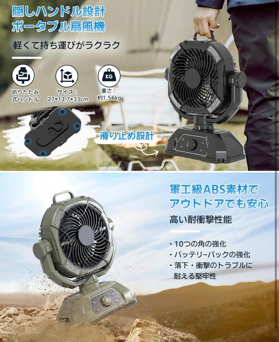 【頑丈な材質・2WAY設置】キャンプ 扇風機は軍工級ABS素材使用された上に丈で耐久性のある構造を採用し、落下や衝突を防くことができ、頑丈な台座は安定性が抜群です。キャンプ扇風機は、「卓上置く」と「吊り下げ」の2つの方法で取り付けることができます。キャンプ扇風機を地面や棚の上に置いたり、本体下部のフックに吊り下げたりして、涼みながら照明として使えます。2つの設置方法で、どこでも涼しく快適に。またハンドルが付いており、簡単にハンドルを握って、キャンプ扇風機を異なる場所に持って行ったり、キャンプやピクニック、スポーツ場などの屋外活動に持ち運ぶことができます。