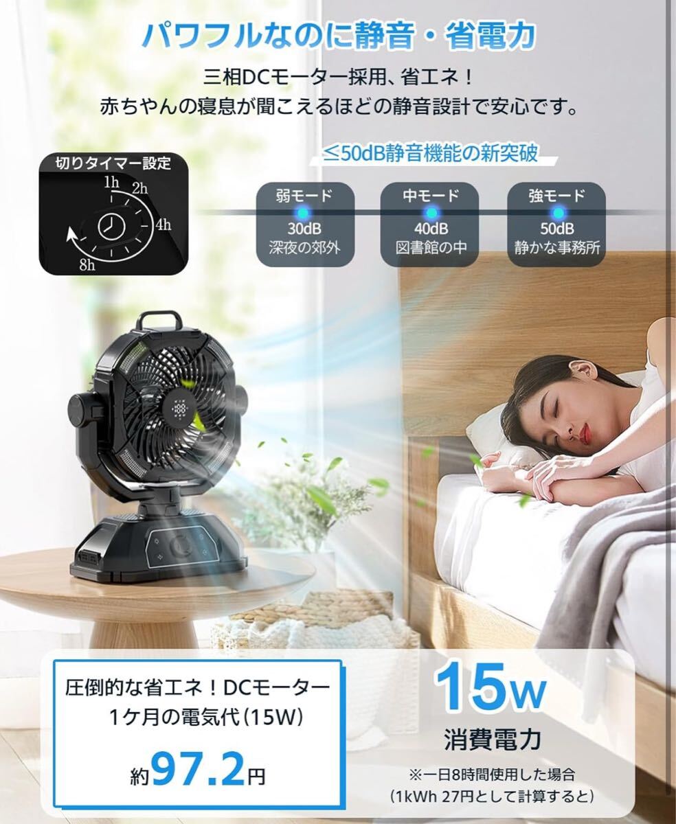 【DCモーター搭で静音・省エネを実現】キャンプ 扇風機は三相DCブラシレスモーターにより、コンパクトサイズでありながらも効率的に風を送り、想像を超える大風量を実現!高効率・静音・長寿命・省エネを実現!消費電力はわずか約15W!ACモーターでは実現できなかった、圧倒的な省工ネ性能です。高性能DCモーターと組み合わせることで、運転中の騒音を極限まで抑えました。人と環境に優しい充電式扇風機!車中泊キャンプ扇風機は静音設計で、ぐっすり眠れる静かさと心地よさを提供、心も身体もすっきりリフレッシュできます。