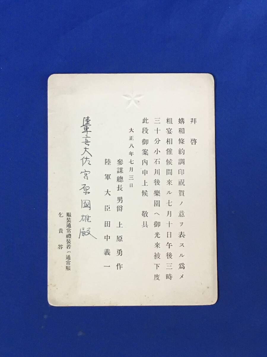 AG103イ●戦前 大正8年7月3日 陸軍工兵大佐 宮原国雄宛 参謀総長男爵上原勇作・陸軍大臣田中義一 講和条約調印祝賀…宴相催案内状 收藏