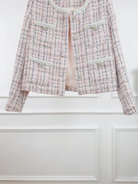 新品秋冬暖かいレディースツイードジャケットレザーコート豪華ビジューピンクM 收藏
