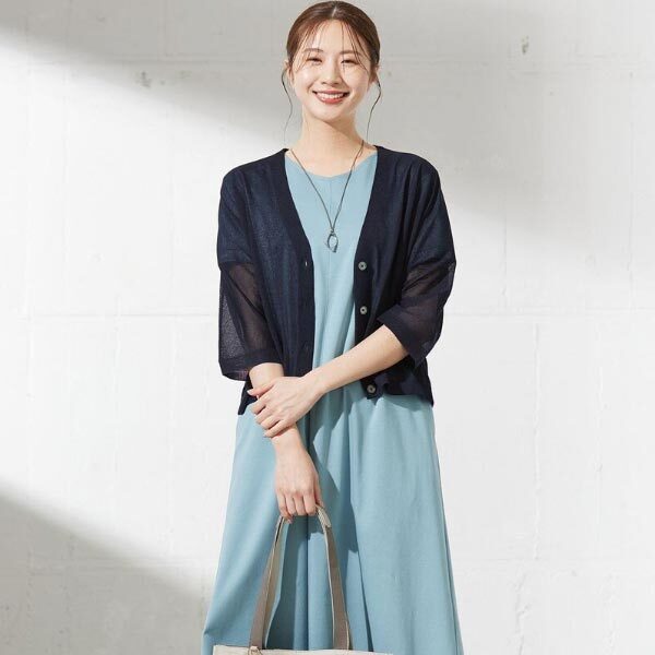 シアー素材で暑い時期にも活躍する、清涼感のある印象のVネックカーディガン。