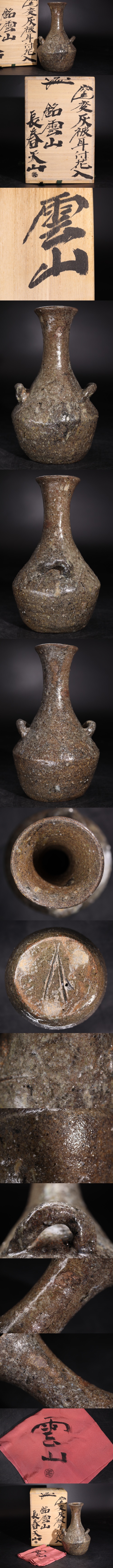 | 長春天山 作 窯変 灰被 耳付 花入 「 銘: 雲山 」 共布・共箱付 / 花器 花瓶 煎茶飾 .G2765 |