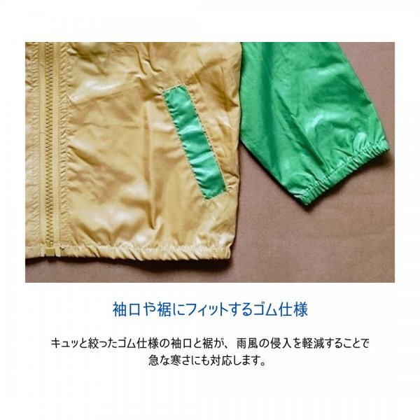 季節の変わり目にぴったりな キッズ用ジャケット。 軽量で薄手だから動きやすく、朝夕の冷え込みや風の強い日にも大活躍! フード付きジャンパー なので急な風や小雨からお子さまを守ります。 軽量&薄手で快適 通園・通学や公園遊びにも最適な 子供アウター。動きやすく着心地も抜群です。 コンパクトに収納可能 付属の収納袋に入れておけば持ち運びやすく旅行や遠足におすすめ。バッグに入れて突然の気温変化にも安心。 おしゃれなカラーブロックデザイン イエロー×グリーンの配色で個性をプラス。グリーン×イエロー もご用意。男の子・女の子どちらにも合わせやすいデザインです。 便利なポケット付き 両サイドに小物を入れられるポケット付き。ハンカチやおやつ入れにも便利! 春・秋にぴったりの羽織りもの 軽くて防風性があり、朝の通学やおでかけの体温調節におすすめです。 園でも安心な紐なしフードを衿まわりに 引っ掛かって事故に繋がりやすいフードや紐は着用禁止の園や学校が多いのですが、衿まわりに簡単に収納できるので安心して使えます。 【商品詳細】 ・対象:キッズ(男の子 女の子 兼用) ・素材:ポリエステル100% ・仕様:フード付き、フロントファスナー、両サイドポケット ・サイズ展開:100cm / 110cm / 120cm / 130cm ・カラー展開:袖グリーン / 袖イエロー ・用途:通園、通学、公園遊び、アウトドア、旅行、春・秋のおでかけ急な寒さや小雨にさっとはおれて便利な、収納袋つきポケッタブルウインドブレーカー。 ※ご利用のパソコン、モニター環境によって、画像の色味が異なって見える場合がございます。予めご了承下さい。 | ||