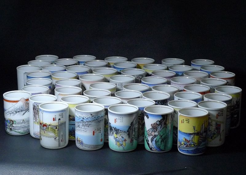 10WS72★幸泉窯 一立斎広重画/歌川広重画 東海道五十三次 色絵湯呑 54客 五十四客 大量 和食器 茶器 收藏