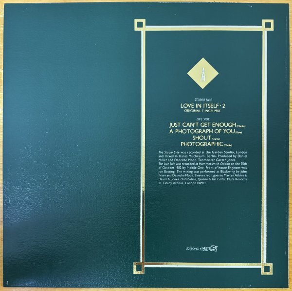 【 収録曲 】 Studio Side A. Love In Itself - 2 (Original 7 Inch Mix) 4:16 Live Side B1. Just Can't Get Enough 5:35 B2. A Photograph Of You 3:45 B3. Shout 4:46 B4. Photographic 3:55 【 Credits 】 Dave Gahan (lead vocals) Martin Gore (keyboards, guitar, vocals) Andy Fletcher (keyboards, Bass) Alan Wilder (keyboards, vocals) ※「Love In Itself - 2」はデペッシュ・モードの9枚目のシングルです。出品商品は限定ナンバー入り12インチ・シングルでB面はライヴ4曲入りとなっています。ライブ曲は1982年10月25日にハマースミス・オデオンで行われた演奏が収録されています。タイトル曲は1983年の3rdアルバム『Construction Time Again』に収録されている「Love In Itself 」のシングルエディット曲です。アルバムバージョンより10数秒短くフェイド・アウトになっている様です。 【 参考音源 】 Love In Itself 2- Original 7" Mix Just Can't Get Enough [Live at Hammersmith Odeon, 25 October 1982] Photographic (live) Shout! (Live in Hammersmith) Photographic (Live in Hammersmith) |