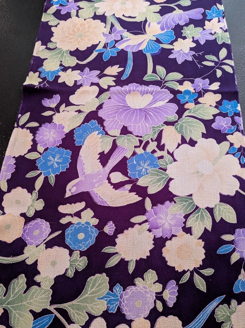 | 地色 : 紫 縮緬と言える位シボの見られるしなやかな糸味で優しい色合いの花鳥模様が描かれたレトロな可愛いハギレです 状態は大変きれいです サイズ(センチ) 33x108 16.5x97(反巾換算約33x156) | |||