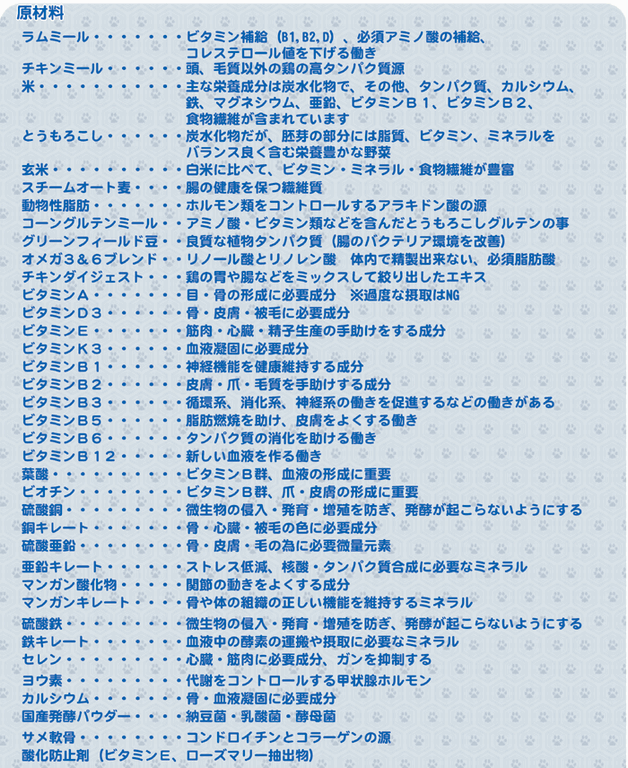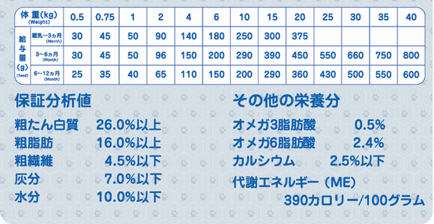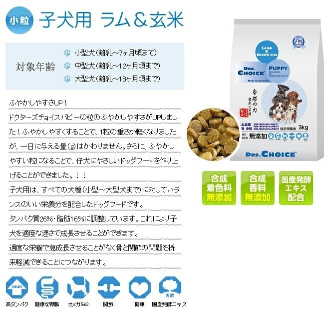 | 商品名 : DRS.CHOICE(ドクターズチョイス) パピー 1kg プレミアムドッグフード(子犬用 パピー 小粒 ラム&玄米 小型犬……離乳から 約7ヶ月頃まで) 中型犬……離乳から約12ヶ月頃まで) 大型犬……離乳から約18ヶ月頃まで) ![]() ■健康の源 自然の力・・・・・国産醗酵エキス・サメ軟骨 ■厳選された食材・・・・・・・ラムミール・玄米 ■皮膚・毛並みのサポート・・・キャノーラ油・亜麻仁油・魚油・ひまわり油 ■自然派保存料使用・・・・・・ローズマリー・ビタミンE ★★★★ DRS.CHOICE(ドクターズチョイス) パピー 子犬用 のおすすめポイント! ★★★★ 1)国産醗酵エキスにより、整腸作用、体臭、便、尿の軽減 2)サメ軟骨の成分による関節の強化 3)オメガのバランスのよい配合によりキレイな皮膚・被毛のサポート 4)食べ易く消化しやすい円盤型の粒 5)多くの固有の生物を守る為に厳しい検疫を行っているオーストラリアにて生産しており、発注してからの生産に なる為、常により良い新鮮な物をお客様へお届けしております。 ![]() ![]() ![]() ドクターズチョイスは、粒の形状にこだわりました 犬はもともと何でも飲み込んでしまう習慣があるので、ある程度の大きさで噛ませて食べさせる必要があります。そうすることにより、消化不良などがおきにくくなり、栄養素も体に吸収されやすくなります。ドクターズチョイスは粒の形状が円盤型となっており、愛犬にとって食べ易く、噛み易い形となっております。噛む事により、脳が刺激され、発育向上を促し、消化不良を防ぎます。 ドクターズチョイスは、AAFCOとNRCの栄養基準をみたしているドッグフードです。 Association of America Food Control Official (AAFCO 米国飼料検査官協会) アメリカで厳しいドッグフード栄養基準を定めている機関です。 National Research Council (NRC 米国国家研究会議家畜栄養委員会) ・合成着色料・合成香料無添加 ・原産国 オーストラリア ![]() 主 成 分 粗タンパク質 26.0%以上 粗 脂 肪 16.0%以上 粗 繊 維 4.5%以下 灰 分 7.0%以下 水 分 10.0%以下 その他の栄養分 オメガ3脂肪酸 0.5% オメガ6脂肪酸 2.4% カルシウム 2.5%以下 390kcal/100g 原 材 料 ラムミール、チキンミール、米、とうもろこし、玄米、スチームオート麦、動物性脂肪、コーングルテンミール、グリーンフィールド豆、オメガ3&6ブレンド、チキンダイジェスト、ビタミンA、ビタミンD3、ビタミンE、ビタミンK3、ビタミンB1、ビタミンB2、ビタミンB3、ビタミンB5、ビタミンB6、ビタミンB12、葉酸、ビオチン、硫酸銅、銅キレート、硫酸亜鉛、亜鉛キレート、マンガン酸化物、マンガンキレート、硫酸鉄、鉄キレート、セレン、ヨウ素、カルシウム、国産発酵パウダー、サメ軟骨、酸化防止剤(ビタミンE、ローズマリー抽出物) ![]() ![]() 他のDRS.CHOICEドクターズチョイスシリーズやドッグフードも出品しておりますよ! |