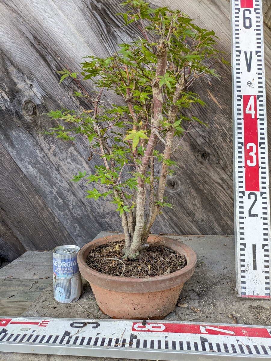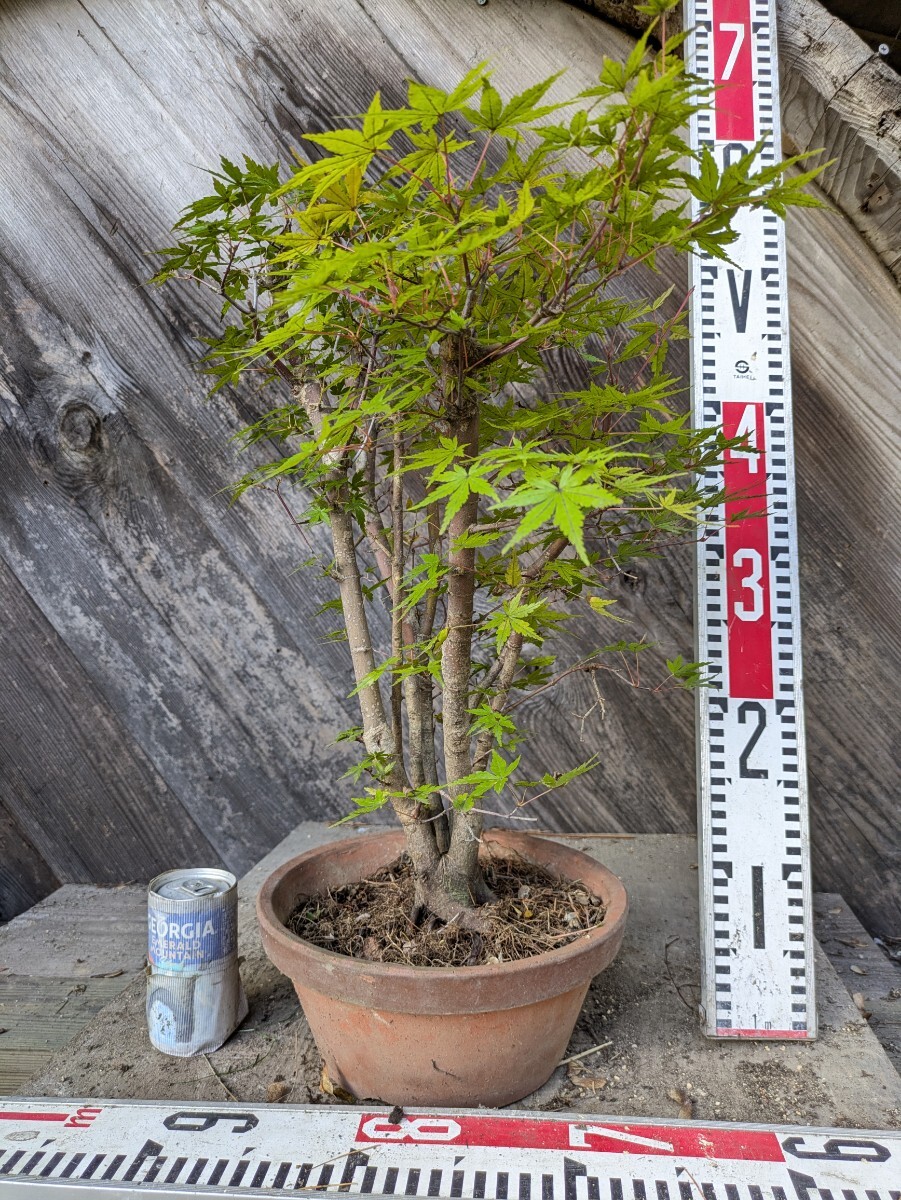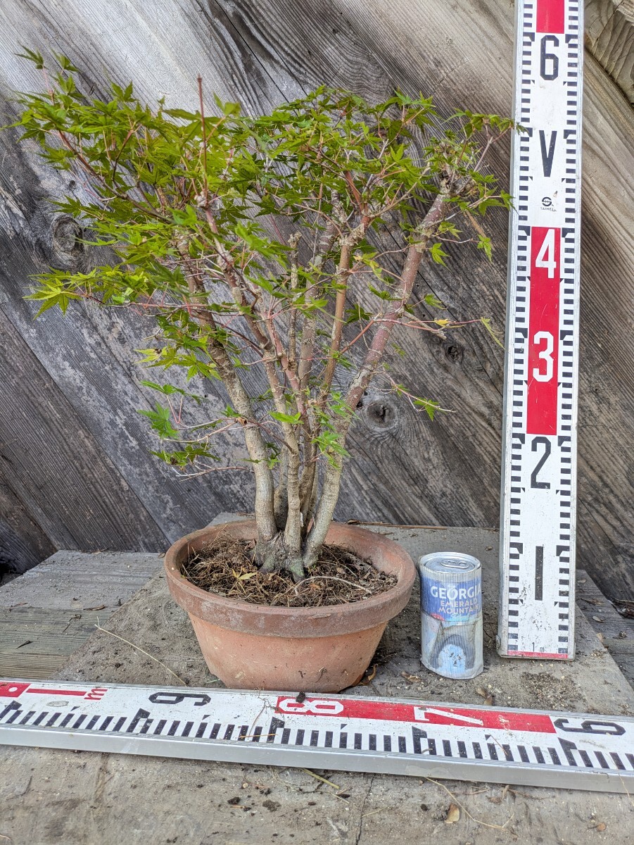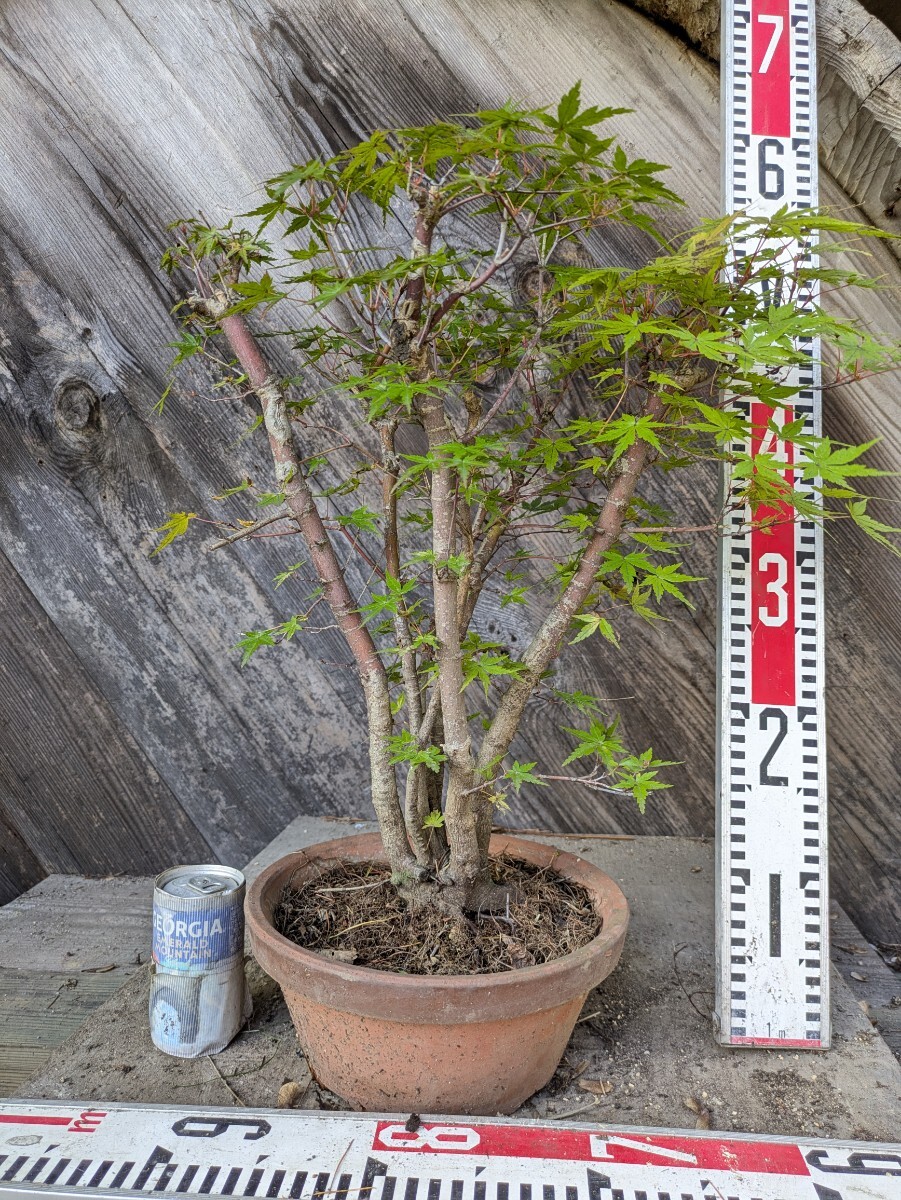 およそは40x30x48cmの枠に入るサイズ。根本付近からの高さは40cmくらい。長年の鉢植えで駄鉢は老朽化してます。株立ちの七幹です。発送梱包の際に痛むヶ所が有るかもしれません。佐川急便にて発送する事も有ります。