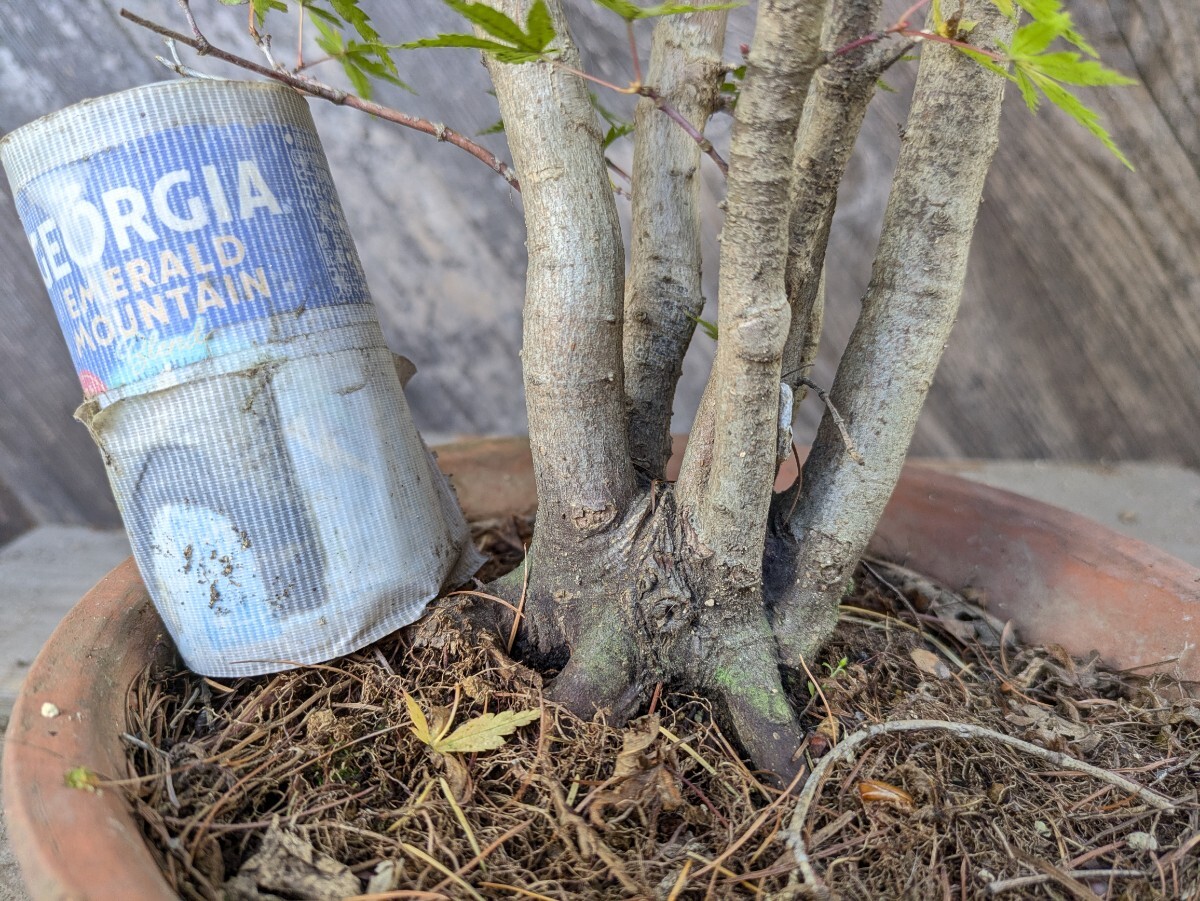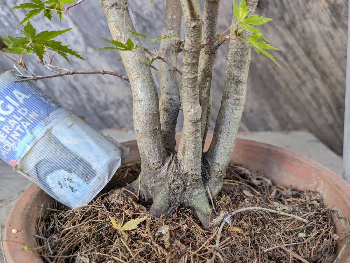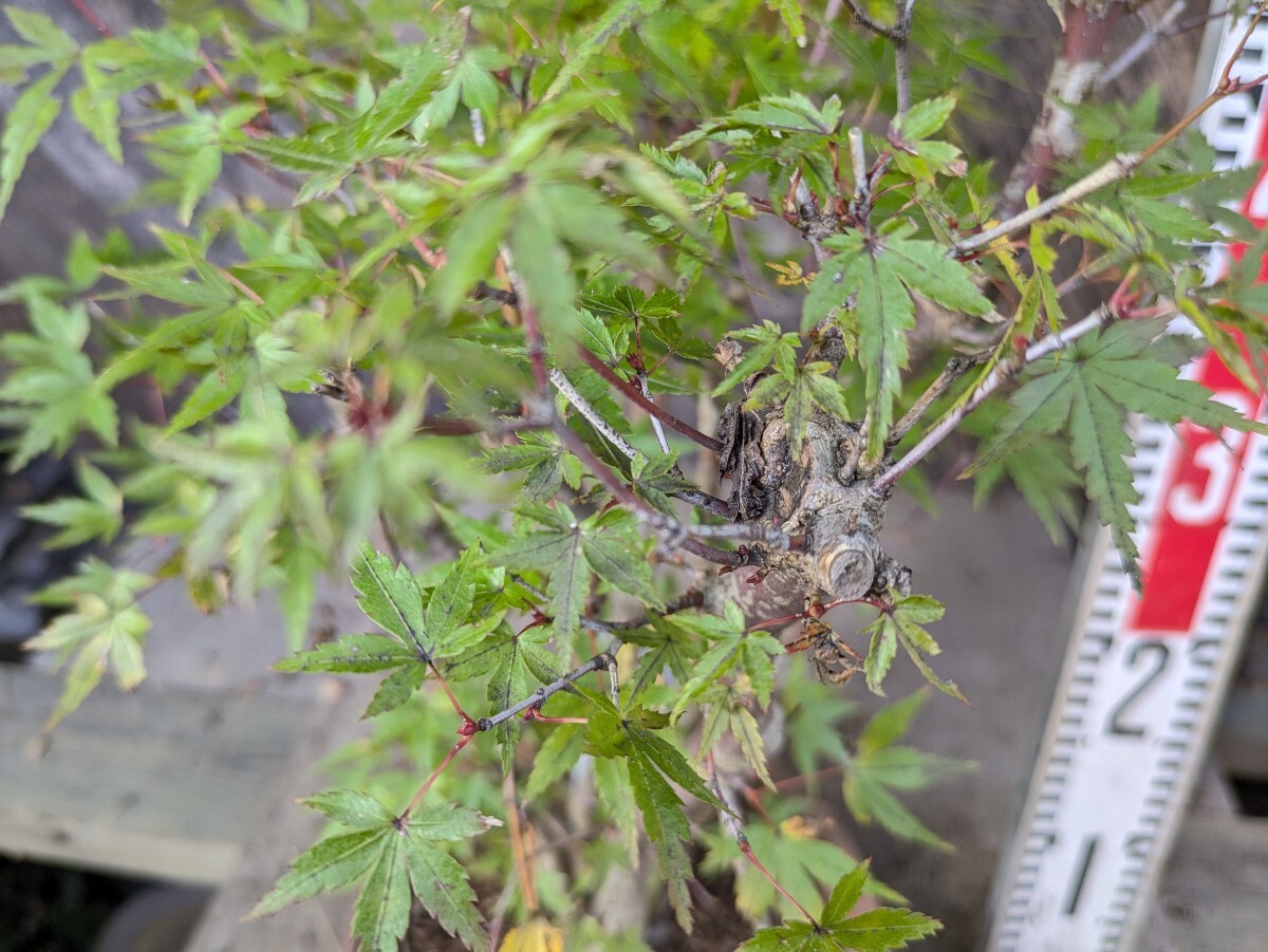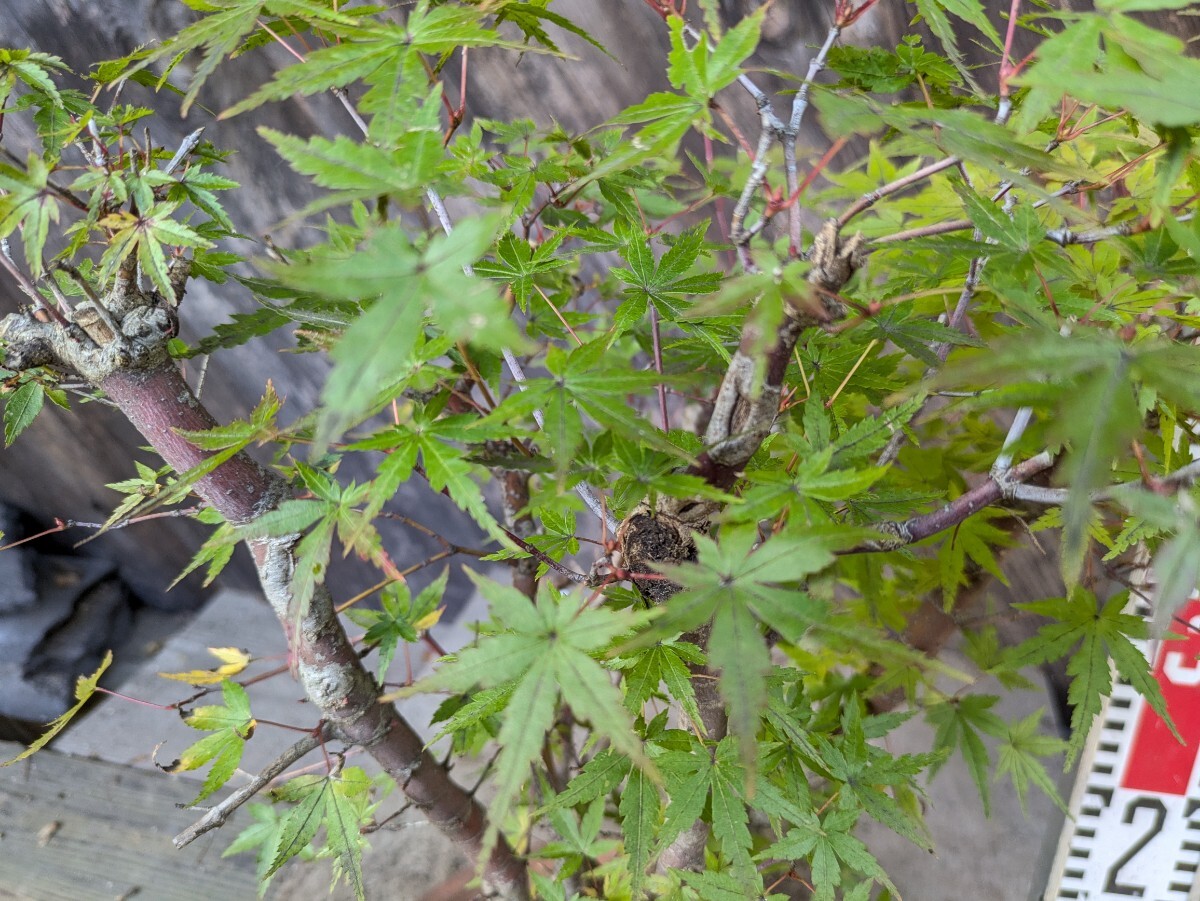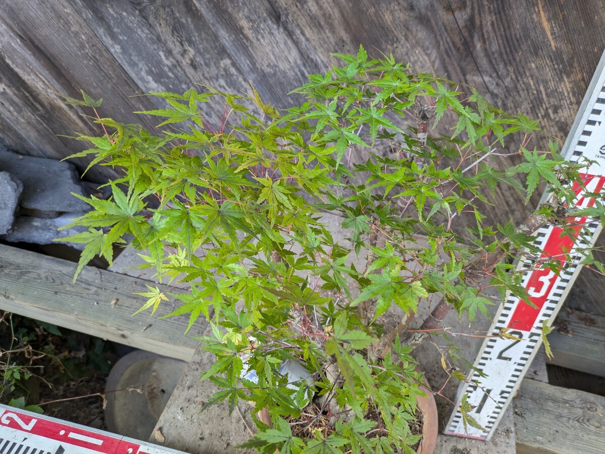 およそは40x30x48cmの枠に入るサイズ。根本付近からの高さは40cmくらい。長年の鉢植えで駄鉢は老朽化してます。株立ちの七幹です。発送梱包の際に痛むヶ所が有るかもしれません。佐川急便にて発送する事も有ります。