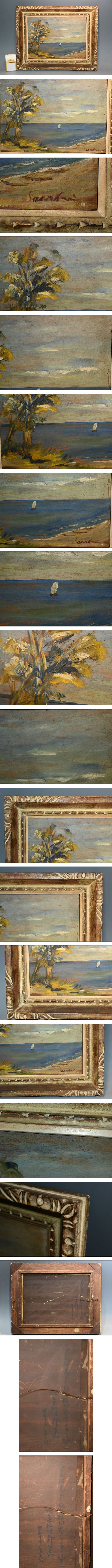 アンティーク絵画 戦前 板絵 作者不詳 油彩 風景画 海 南国 額装 肉筆 詳細不明 絵画 油絵 古美術 現状引渡 検:三重県 收藏