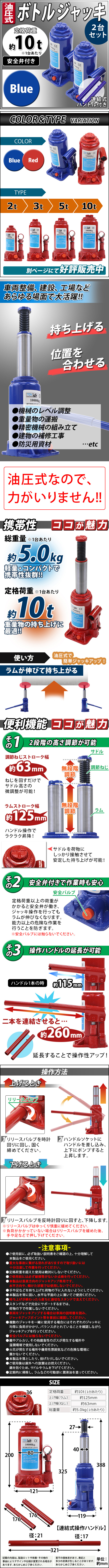 送料無料 油圧式 ボトルジャッキ 定格荷重約10t 約10000kg 2台セット 2個 油圧ジャッキ だるまジャッキ ダルマジャッキ 安全弁付き ブルー 收藏
