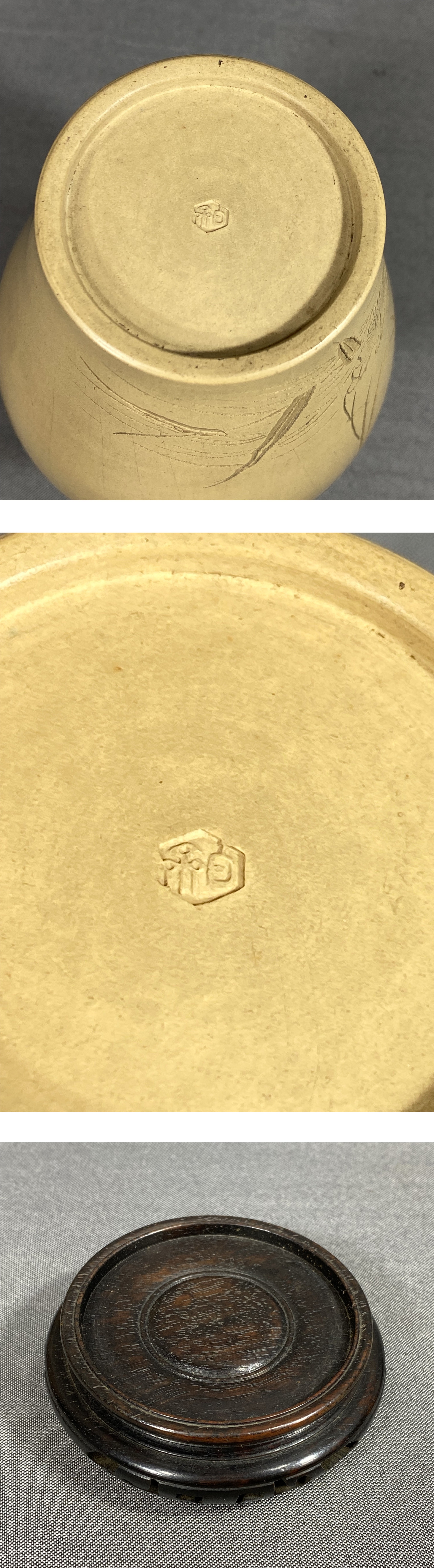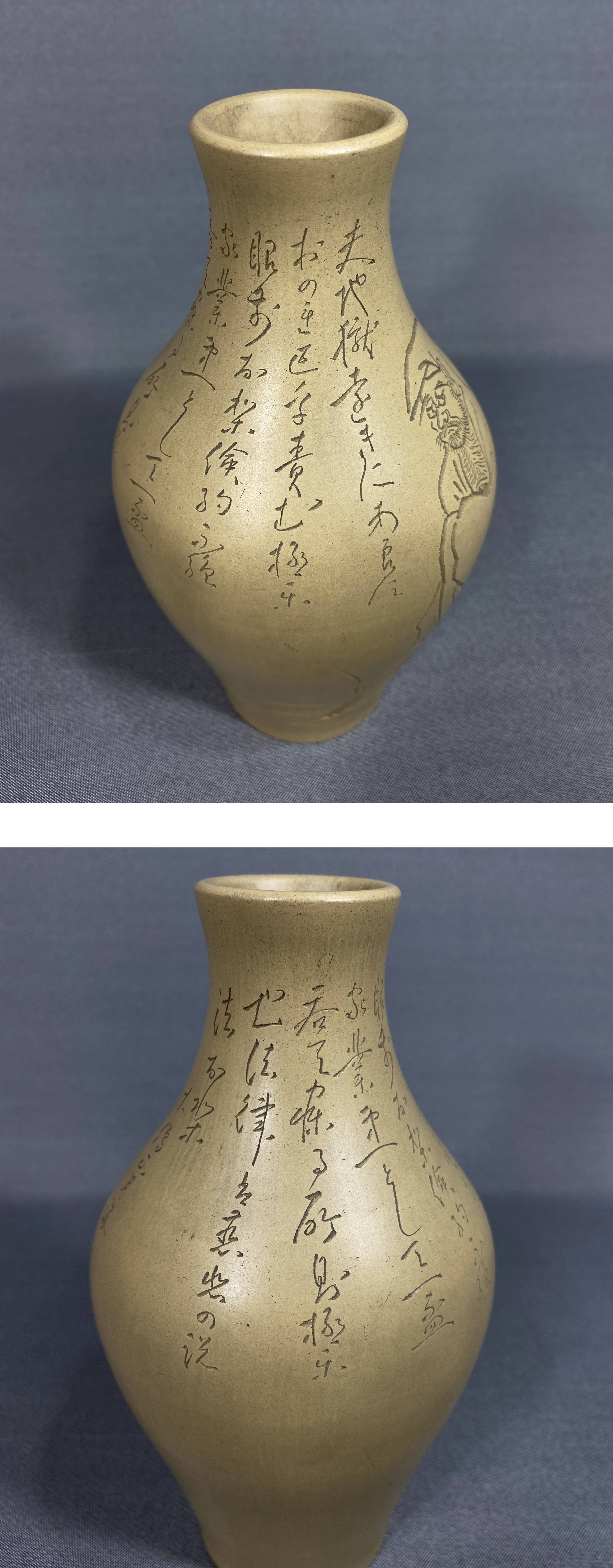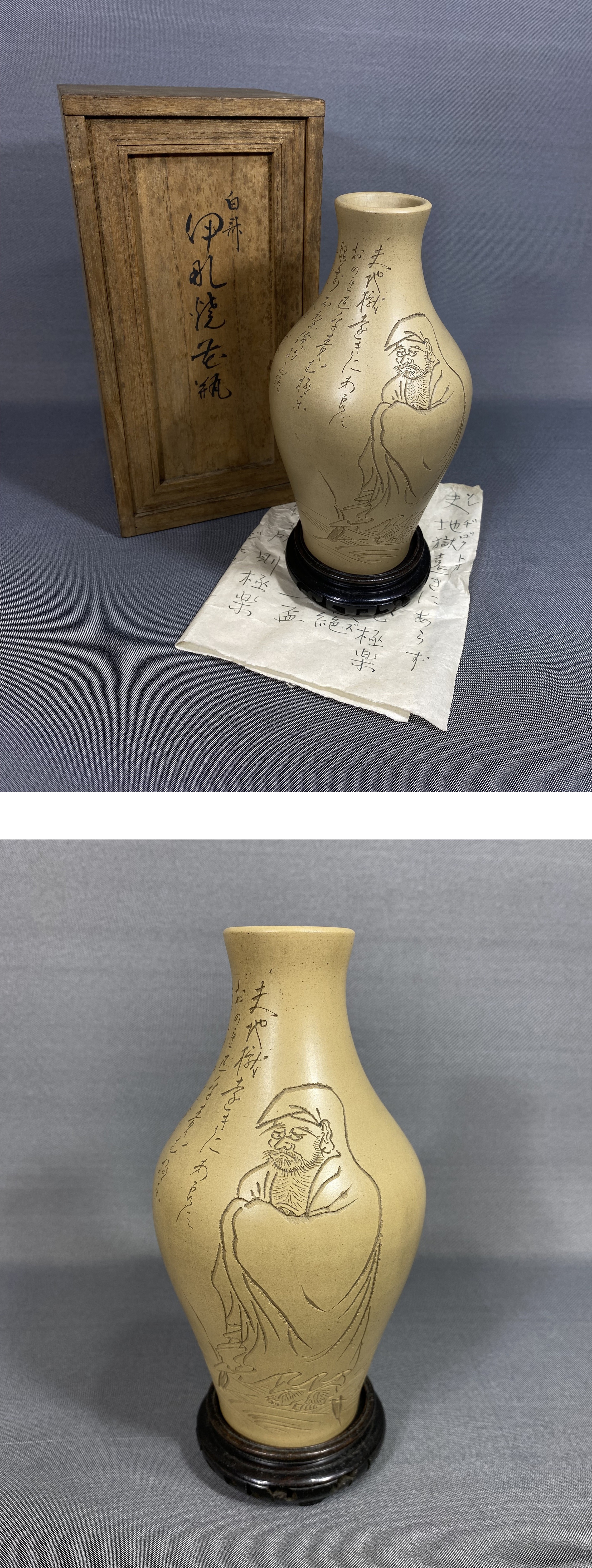 【風車】常滑名工 磯村白斎 作 売茶翁 月海元昭 詩文 達磨図 白泥 花入 煎茶道の祖▲在銘 共箱 台付▲明治時代の陶工 美品 花瓶 收藏