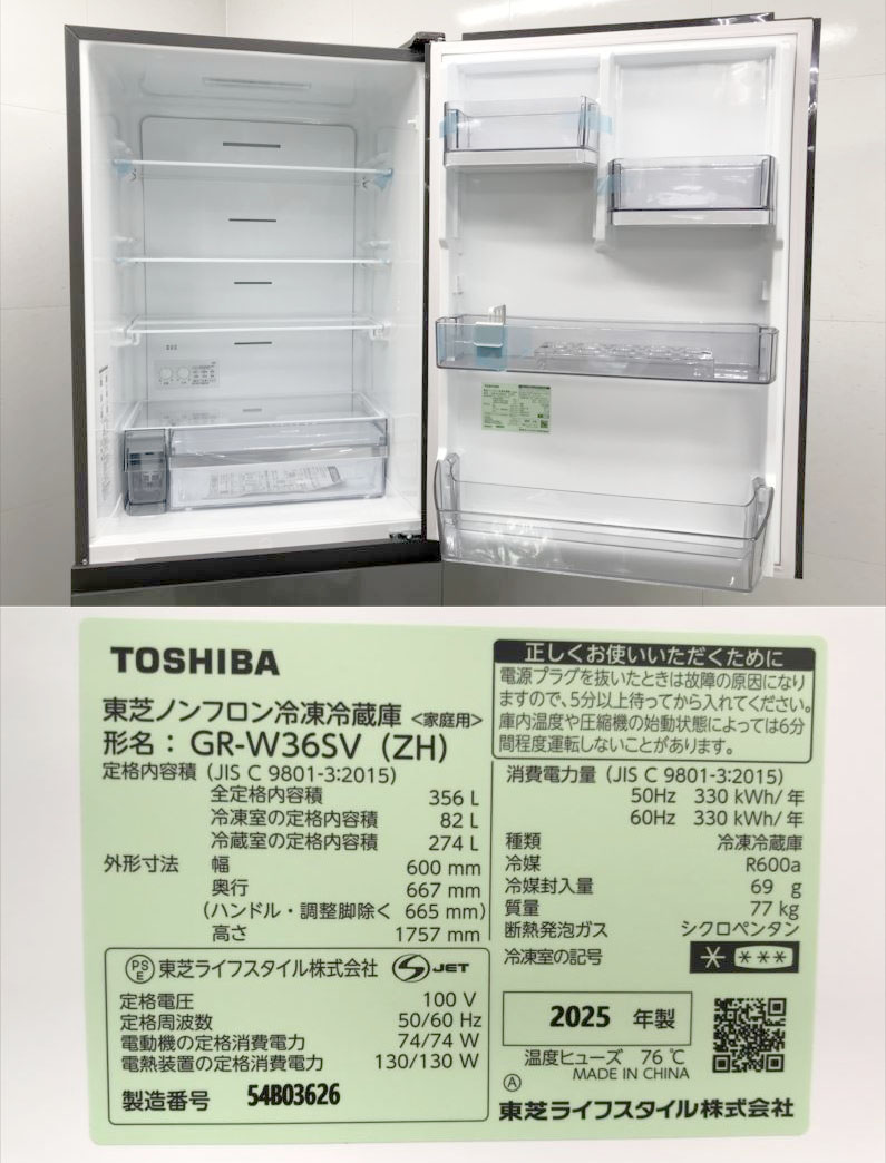 E1943YO ■0123【美品】冷凍冷蔵庫 356L 右開き 3ドア 東芝 GR-W36SV(ZH) 25年製 VEGETA(ベジータ)家電 收藏