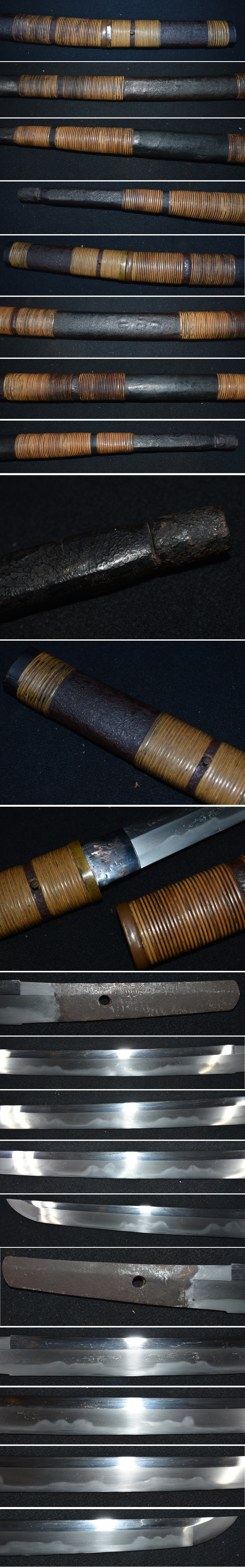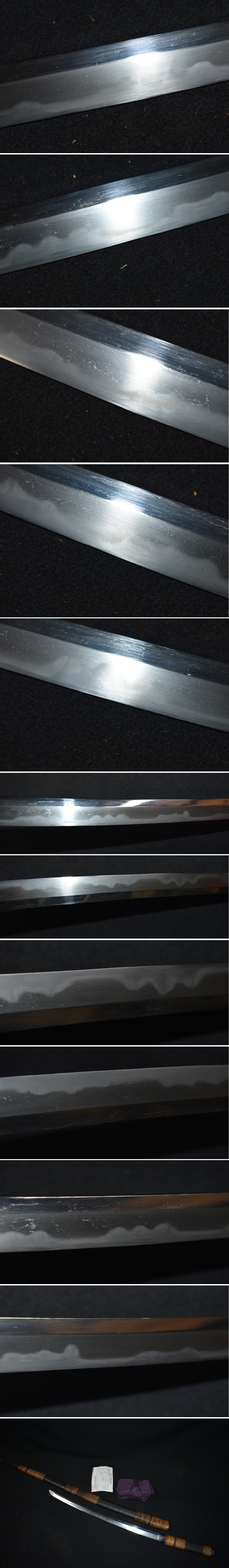 ご覧頂きありがとうございます。今回出品する品は写真の脇差です。 銃砲刀剣類登録証番号 群馬 第55457号 種別 わきざし 長さ 46.1センチ 反り 0.9センチ 目くぎ穴 1個 元幅約2.7センチ 元重約0.7センチ 先幅約1.8センチ 在銘 景光 大変珍しい景光の仕込み杖です。備前の鎌倉期の名工である景光の脇差です。 拵えは仕込み杖であり、珍しい仕込み杖です。藤巻きに石目地塗で鯉口は銅地金具が付いています。 杖として使えるように石突きも付いています。拵えにガタツキ無く状態はいいと思います。 刀身は、初茎の在銘品で鎬造りの乱れ刃紋です。刃紋は鎌倉期の一文字である丁子乱れ刃紋です。 さすが景光の刃紋と言えます。研ぎも上研ぎの研磨済みですので綺麗で、錆や刃こぼれやハギレはあ りません。 綺麗な丁子乱れが見事な刃紋です。ハバキは赤銅着せの高級ハバキです。仕込み杖は、江戸後期から 明治期にかけて多く作られました。その際に鎌倉期の名工の「景光」をいれて作られた仕込み杖です ので、かなりの権力者が注文して作った特注品だと思います。 当時の動乱時代は、暗武器や護身用として作られ、財界人や豪族などの方が持っていました。 是非、時代の名品をよろしくお願いします。 状態もよく、研ぎも綺麗です 景光 備前国・鎌倉中期・古刀最上作 鎌倉時代中期、備前国長船にて、巨匠光忠があらわれ、刀剣史上最も大きな流派である長船派が開 かれます。 同派は、同時期の蒙古襲来による刀剣需要に、大工房を構えて応えました。光忠の子である長光は、 光忠の作風を踏襲した豪壮な姿に、丁子を主とした華やかな刃文の出来口、また焼幅を抑えて「用」 に重きを置いた直調子のものまで作域広く示します。 上述の需要のほか、朝廷・幕府などからの多数の要請に対し、長船派二代惣領として応えた名工であ ります。 景光は、長船派嫡流、長光の子で、同派の三代目惣領です。作風は、身幅抑えて尋常もしくはやや細 身の姿、重ね厚く、直刃や互の目、丁子乱れを主体としたものがあります。 [国宝 備前国長船住景光/元亨二年五月日(号 小龍景光)(東京国立博物館蔵)]をはじめ、国指 定の重要文化財や重要美術品などに名品が遺されます。光忠、長光、景光の三代にわたる名工により、 長船派の基盤は揺るぎない確固たるものとなります。 あとは写真と画像を見て判断してください。質問はわかる範囲でお答えしますので、入札前にお願い いたします。 発送はゆうパックの着払いです。 ※注意事項※落札しましたら、登録のある教育委員会に所有者変更届(名義変更)を出してください。 よろしくお願いいたします。 |