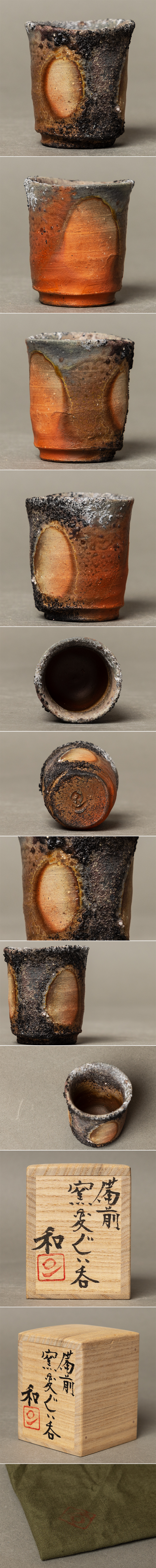 抜群の焼成! 藤原和 備前窯変ぐい呑 共箱・共布付 ■本物保証■ 父・人間国宝 藤原雄 祖父・藤原啓 收藏