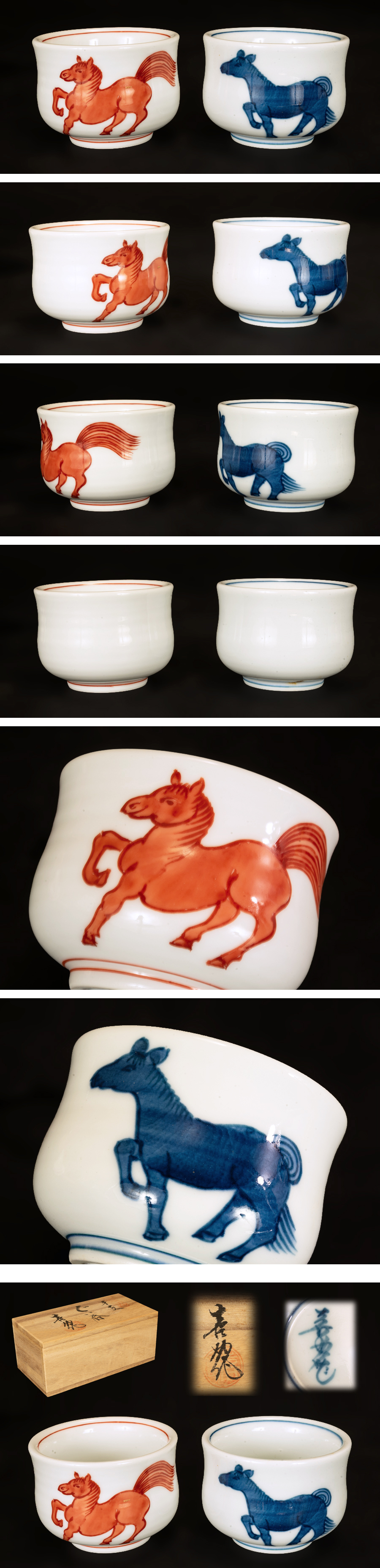 ●舘林喜助 作 ぐい呑 紺朱 馬 午 酒盃 共箱 美品 父 舘林源右衛門● 收藏