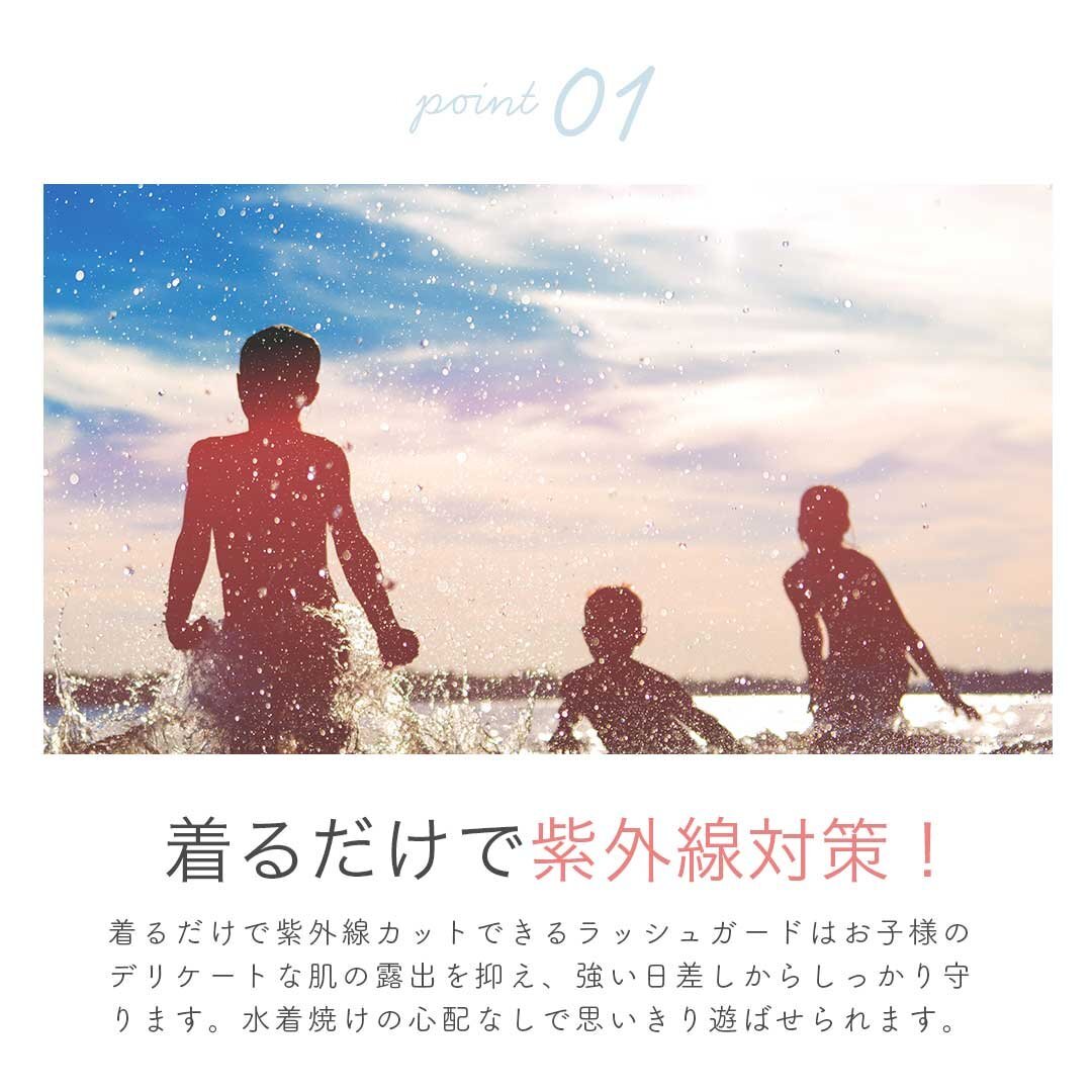 着るだけで紫外線カットできるラッシュガードはお子様のデリケートな肌の露出を抑え、強い日差しからしっかり守ります。水着焼けの心配なしで思いきり遊ばせられます