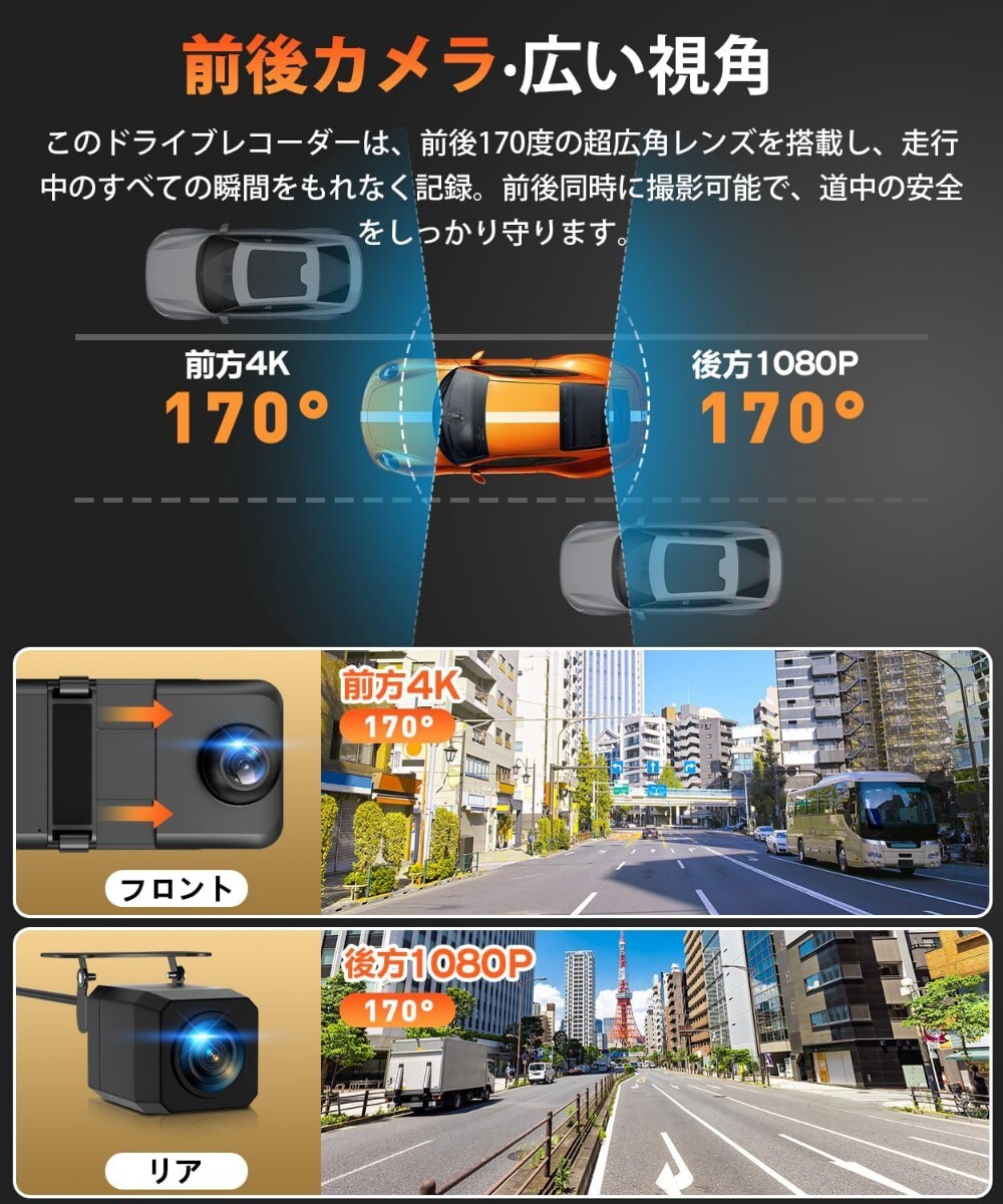 ドライブレコーダー ミラー型【2025年・4K画質・シガー電源/降圧ケーブル対応】ドラレコ 前後170°広角 HDR/WDR暗視 11インチ 收藏