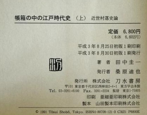 ・書名:帳箱の中の江戸時代史 上 (近世村落史論)  ・ISBN:4887081219 ・著者:田中圭一 著 ・出版元:刀水書房 ・刊行年:1991/08/30 初版1刷 ・解説:天、地、小口に経年によるシミ、ヨゴレあり 思想・哲学・宗教・歴史など人文学、社会科学のメインのジャンルにするネット古書店です。