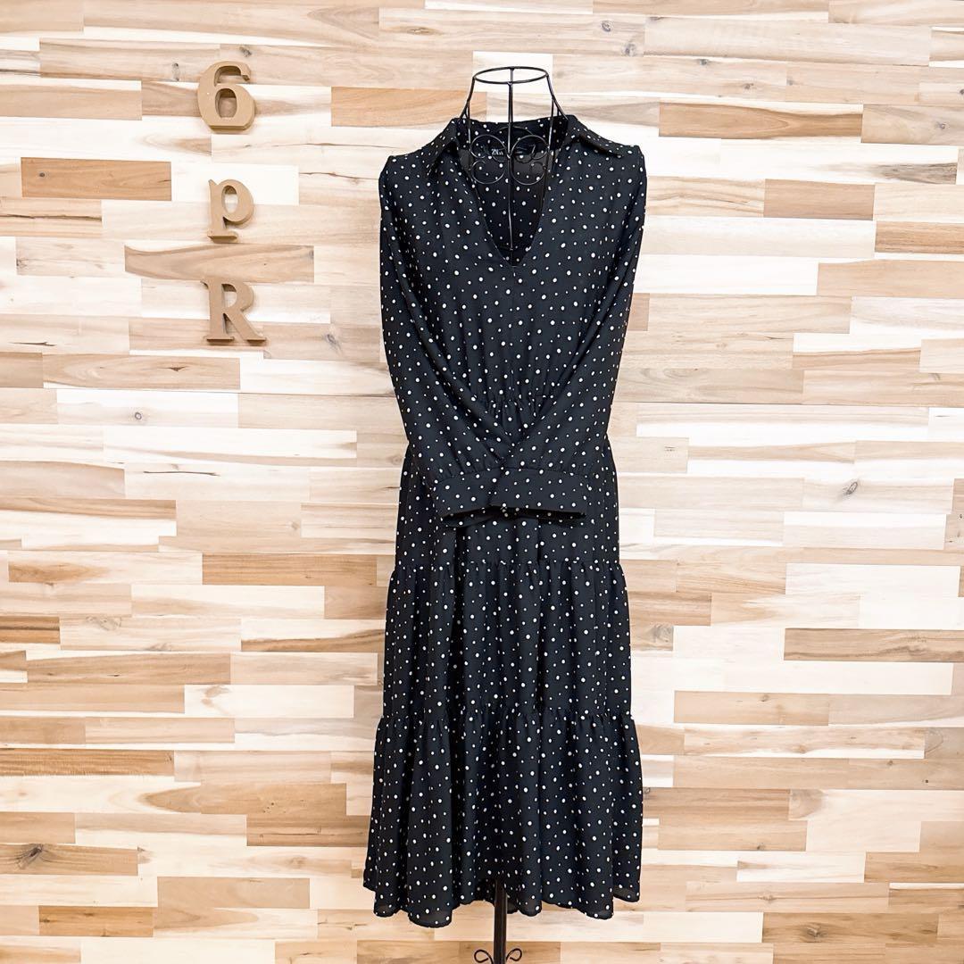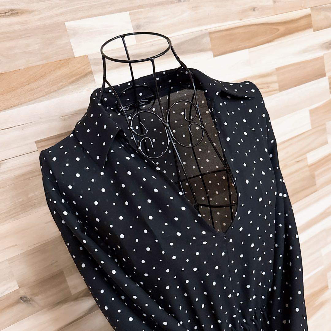 * スキッパーネック / 水玉 *サラリとした軽やかな質感と落ち感のある柔らか素材が魅力的。ウエストのギャザーとスカートのティアード切り替えがアクセントとなった深みのあるブラックをベースに大小のホワイトドットがリズミカルに映え、シャツ襟×Vネックのスキッパーデザインで抜け感のある印象を与えてくれるZARAのワンピースです。※LGスタイラーにて除菌リフレッシュ・スチームクリーニング済みです。