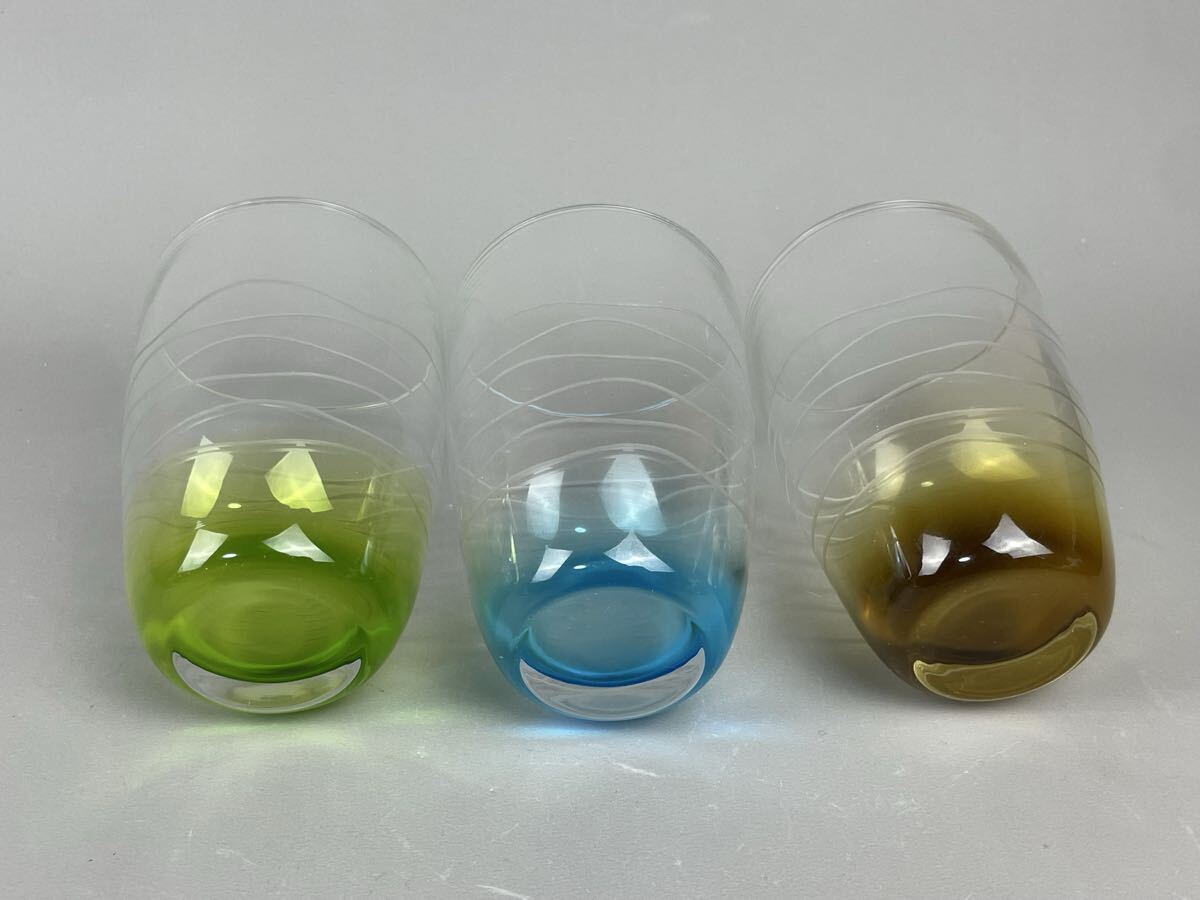 工芸硝子 昭和レトロ エメラルドペアグラス 3点セット まとめ売り ブルー グリーン 食器 ロックグラス 收藏