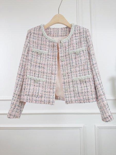 新品秋冬暖かいレディースツイードジャケットレザーコート豪華ビジューピンクL 收藏