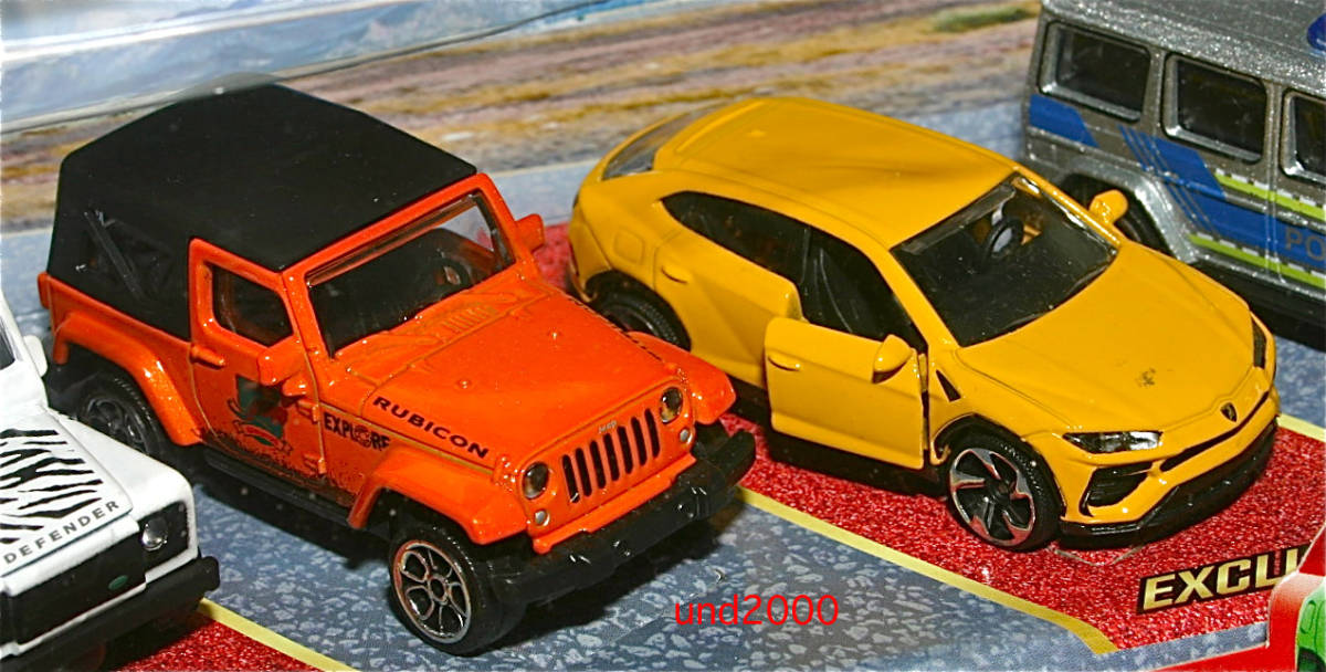 Majorette 4x4 SUV Gift Pack。 Mercedes AMG GT (POLIZEI)、Jeep Wrangler Safari、Lamborghini Urus 2色、Land Rover Defender の5台セット。トミカ・サイズ。並行輸入品。未使用品ですが、箱の透明プラスチック、上部前方の角に沿って大きな割れがあり状態がよくありません。量産品の製品のクオリティーについてはノークレームでお願いいたします。お支払いはヤフーかんたん決済のみ。東京発、ゆうパック持込60サイズ(東京700円 - 沖縄1330円)、または定形外郵便(追跡番号、保険無し)920円での発送となります。(上記の送料はこの出品物のみの料金となります。複数落札、同梱包発送の場合、重さ、サイズが変わりますので送料が変わります。)3日以内のご連絡、かんたん決済の支払期限内(通常5日、支払方法により異なります)のお支払い厳守でお願いします。入札される前に自己紹介もお読みください。 検索用 Mercedes Benz ベンツ
