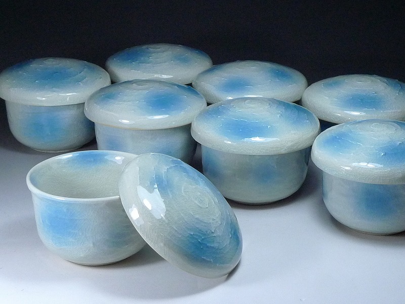 80WS17★有田焼?青磁 ブルー 蓋物 8客揃 蓋付き茶碗 飯碗 向付 小丼 小鉢 おひつ 割烹 和食器 伝統工芸品 收藏