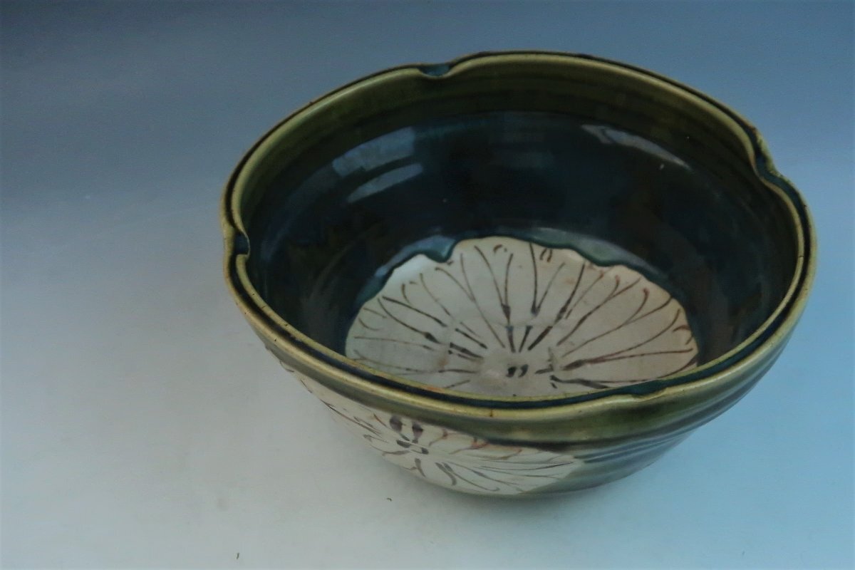 時代物 織部焼 古瀬戸窯 加藤作助(作介) 青織部 鉄絵 菊花文 八寸大鉢 菓子鉢 無傷 茶道具 和食器 古陶磁器 古美術骨董品 BNT133【遅日亭】 收藏