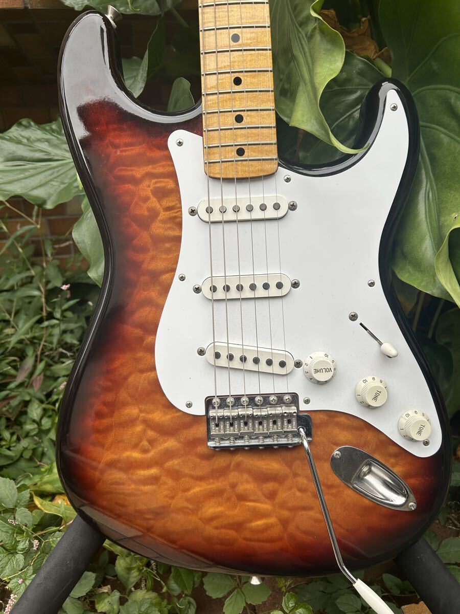 20年から30年前に中野のギターハウスさんで購入したFENDER Japanカスタムメイド ST59-210です、その頃は若いころで社員にプレゼントであげてしまいましたが、どうしてもあのルックスと出音で再度欲しくなり2年位前にチバカン楽器さんで中古で取り扱いがあるとの事ですぐに購入しました。たしか24万位だったと思います。 フレイムメイプルネック&フィンガーボードでボディ正面はキルテッドメイプルです。| 出价者 | 信用 | 价格 | 时间 |