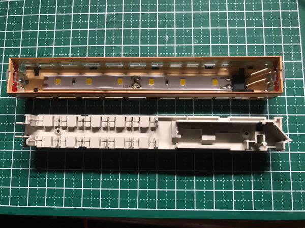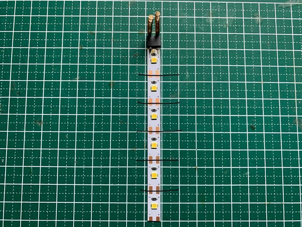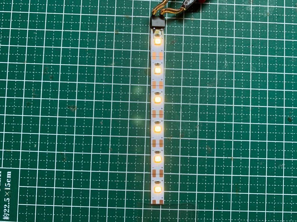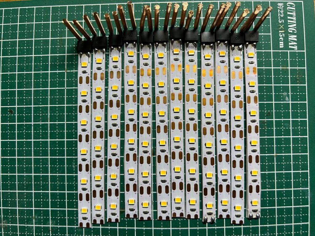 注意事項 :既存のテープLED室内灯を変更、改良し当方の所有車両で動作不良もないことから当オークション向けに製作し出品します。前回品同様に強度を確保するためテープLEDにプラ板を貼り付け3M製強力両面テープを使用していますのでしっかり取り付けられます。1本1本手作りのため数量限定です。なお、点灯確認後出品しておりますが、素人製作のため細かい部分(ハンダ付けなど)はご容赦ください。1本あたりの長さはダイオード(黒色のもの)を含めて約10.8cmです。また1本あたりの消費電力は0.48wです。製品は1本あたり6個のLEDですが、取り付け車両に応じてカット可能となっています。6個LEDは中間車両、5個LEDは先頭車両と使い分けが可能です。長時間点灯(30分以上連続点灯すると、人肌程度の熱を持つ場合があります。模型自体に影響はありませんがご注意ください。)