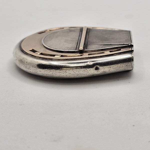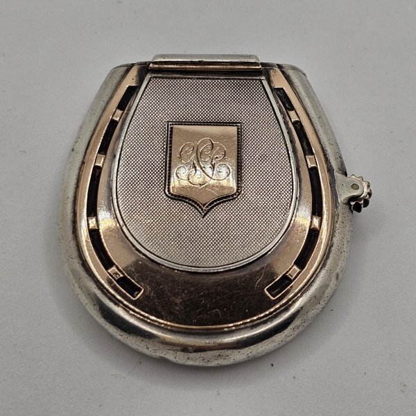 幸運のモチーフとして知られる馬蹄(蹄鉄)を象ったデザインが特徴で、美しい銀の輝きと、銅色のアクセントが組み合わされた芸術的な一品です。