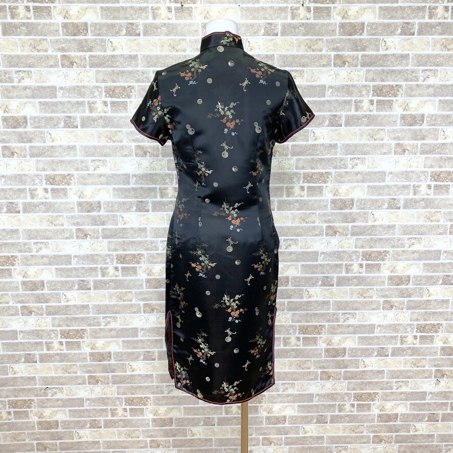 1円チャイナドレス【ネコポス可】 ロングワンピース 34 黒系柄 カラードレス キャバドレ イベント 中古15525