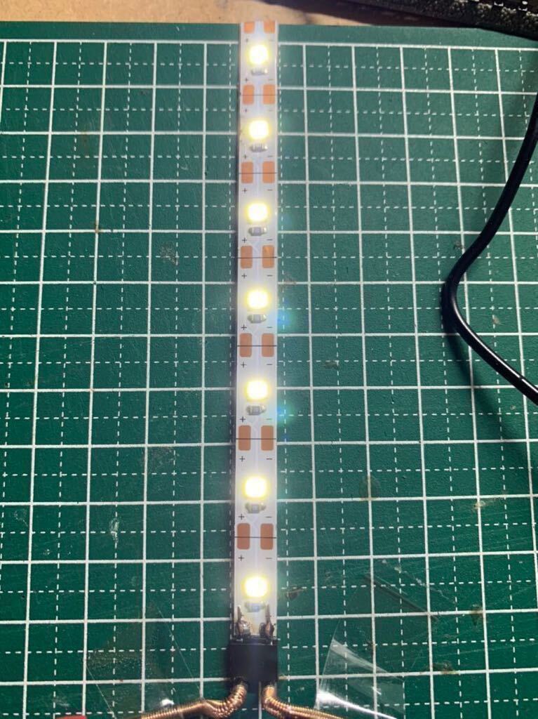 既存のテープLED室内灯を変更、改良し当方の所有車両で動作不良もないことから当オークション向けに製作し出品します。前回品同様に強度を確保するためテープLEDにプラ板を貼り付け3M製強力両面テープを使用していますのでしっかり取り付けられます。1本1本手作りのため数量限定です。なお、点灯確認後出品しておりますが、素人製作のため細かい部分(ハンダ付けなど)はご容赦ください。1本あたりの長さはダイオード(黒色のもの)を含めて約10.8cmです。また1本あたりの消費電力は0.48wです。製品は1本あたり6個のLEDですが、取り付け車両に応じてカット可能となっています。6個LEDは中間車両、5個LEDは先頭車両と使い分けが可能です。長時間点灯(30分以上連続点灯)すると、人肌程度の熱を持つ場合があります。模型自体に影響はありませんがご注意ください。