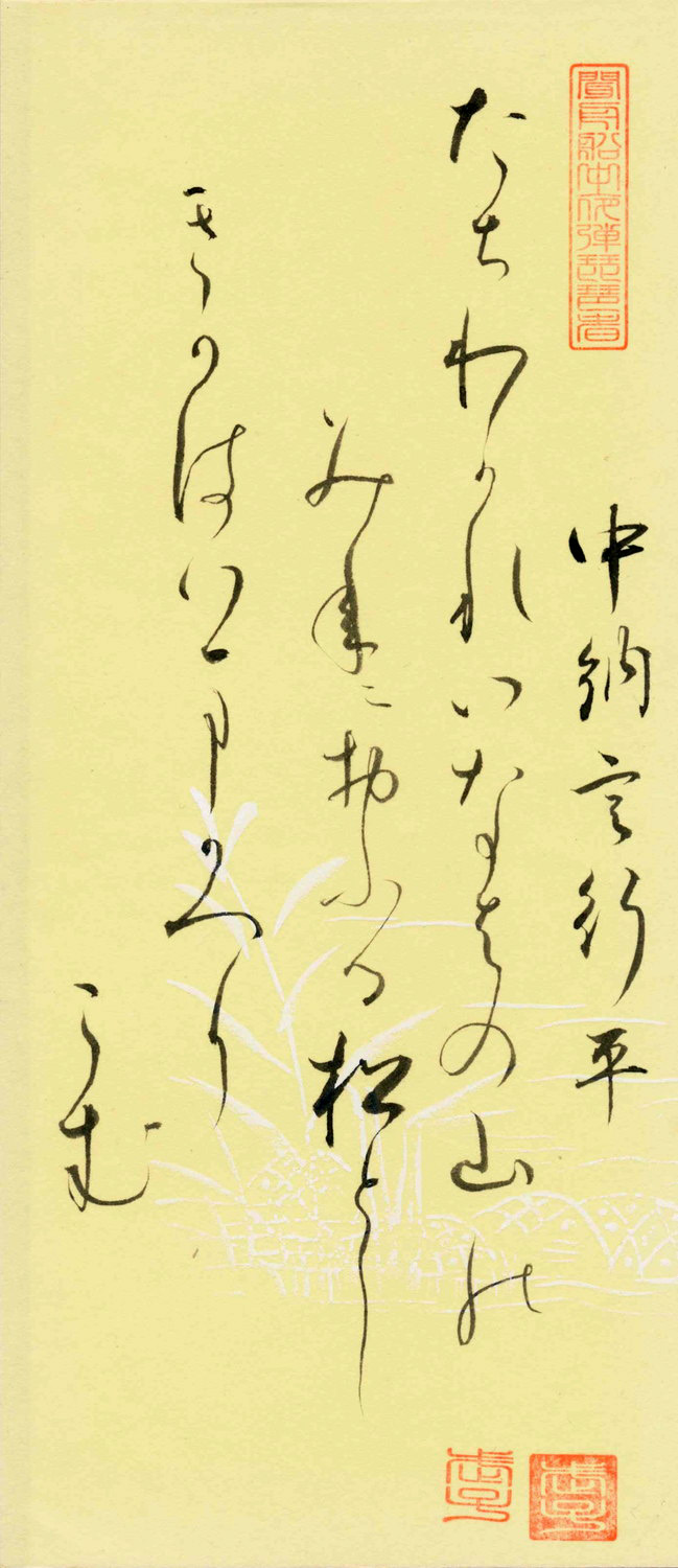伊達孝子(たかこ)の和歌は「ちらし書」と呼ばれる書法です。文字を散らして布置するわが国独自の書き方です。この書法の歴史は平安時代の康保3年(967)の「紙背仮名消息」(滋賀・石山寺)、同じく平安時代の公卿・藤原公任(きんとう)自筆『北山抄』「仮名消息」(京都国立博物館)が知られております。各行に高低の変化をつけ、流暢(りゅうちょう)に続く連綿はきわめて美しいもので「百人一首」の書法として平安時代の公卿卿などの間で広まり、その後大名家の姫君の間で用いられておりました。