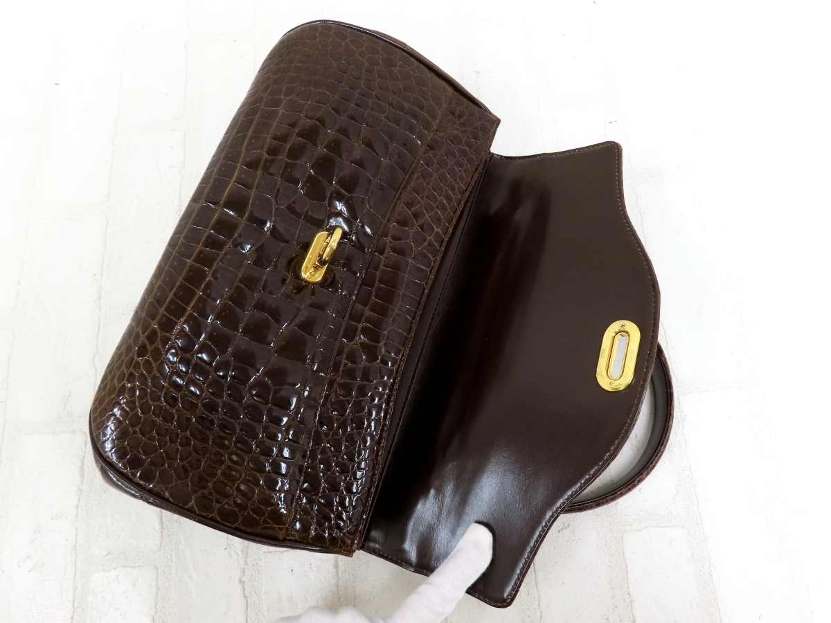 ◆超美品◆GENUINE◆シャイニング クロコダイル 本 ワニ 革◆ハンド バッグ◆ブラウン G金具◆腕掛け◆フラップ◆トップハンドル◆A15363 收藏