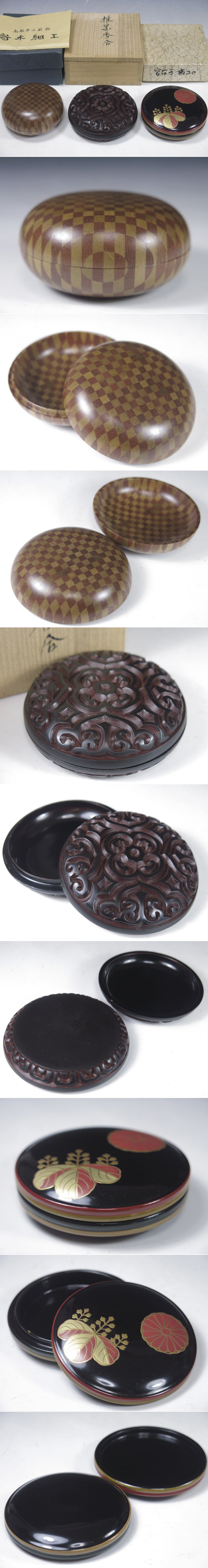| 商品名 | 香合 3点まとめて 寄木細工 堆黒 独楽塗 木製 木工芸 箱付 茶道具 煎茶道具 |