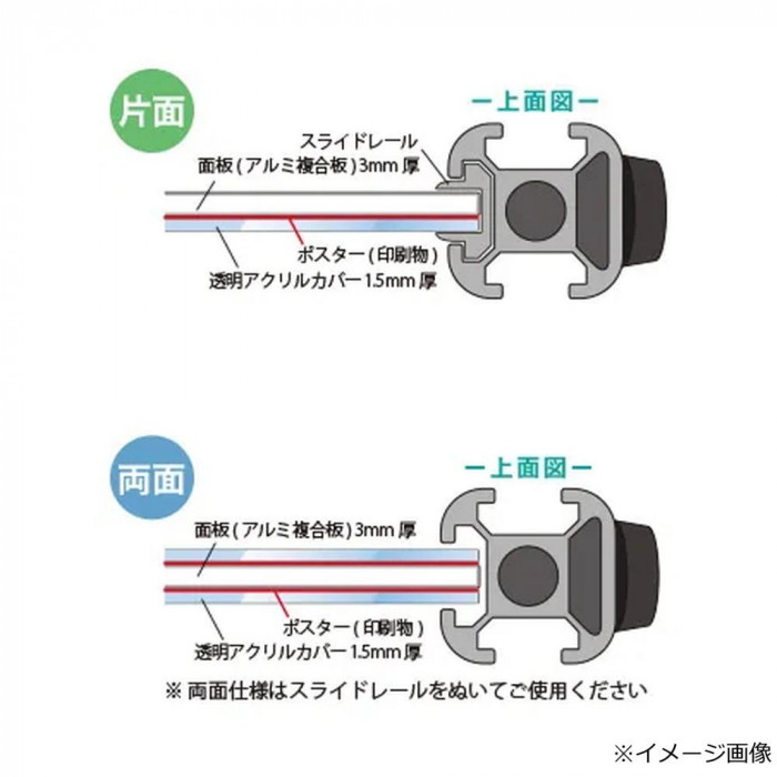 | 素材・材質 | 本体フレーム:アルミ押出し材(アルマイト仕上(シルバー)) 表面カバー:アクリル(透明1.5mm厚) 面板:アルミ複合板(白、3mm厚) |
