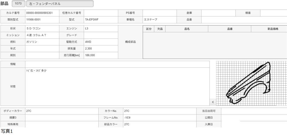フォード エスケープ EP3WF カラー:27C 左 フェンダーパネル /送料 M/905351 收藏
