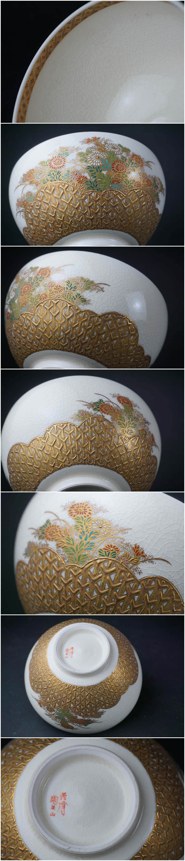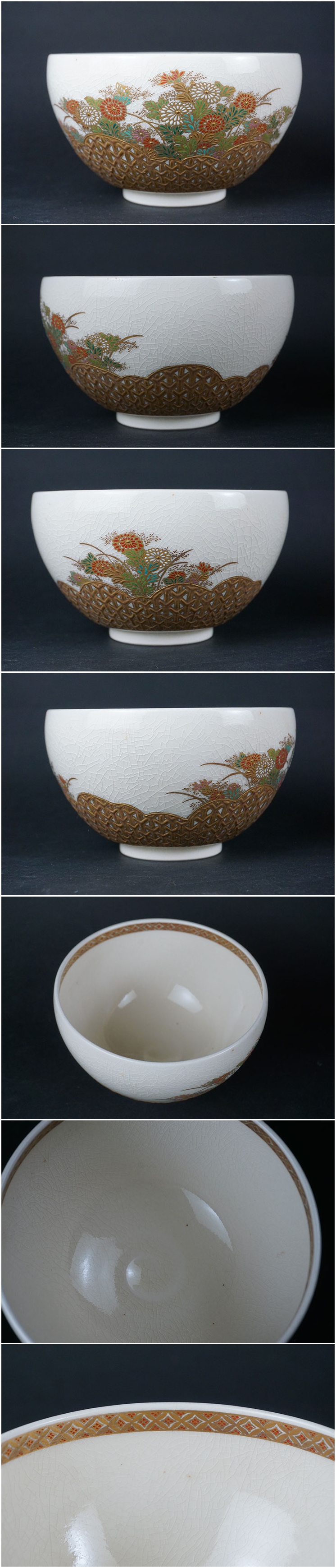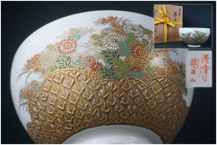 | 薩摩白磁に高台付近にぐるっと金彩の籠を絵付けし、 花を描いた大変豪華な茶碗です。 僅かな使用感のみ、大きな傷はありません。画像ご参考の上ご入札ください。 重さ218g 口径11.9cm 高さ7.6cm 台径5.1cm | |||